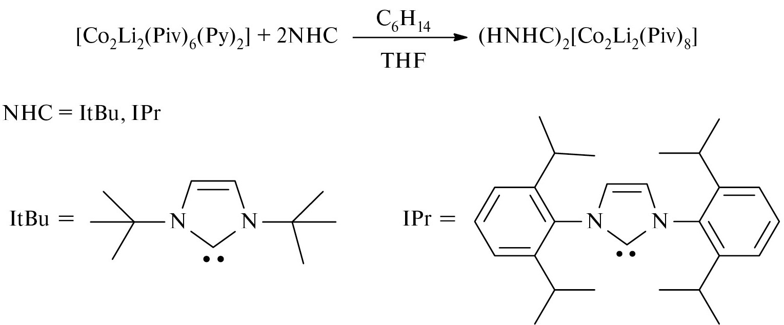 Следует отметить, что анионные карбоксилатные комплексы встречаются в литературе относительно нечасто. Значительная часть таких соединений опубликована достаточно давно [66–71]. Комплексы (HItBu)2[Co2Li2(µ2-Piv)6(Ƙ1-Piv)2] (I) и (HIPr)2[Co2Li2(µ2-Piv)6(Ƙ1-Piv)2] (II) были получены в результате взаимодействия ранее синтезированного соединения [Co2Li2(Piv)6(Py)2] с двумя эквивалентами N-гетероциклических карбенов (NHC) (схема 1).