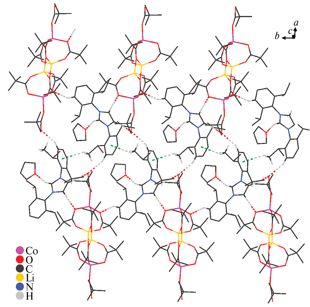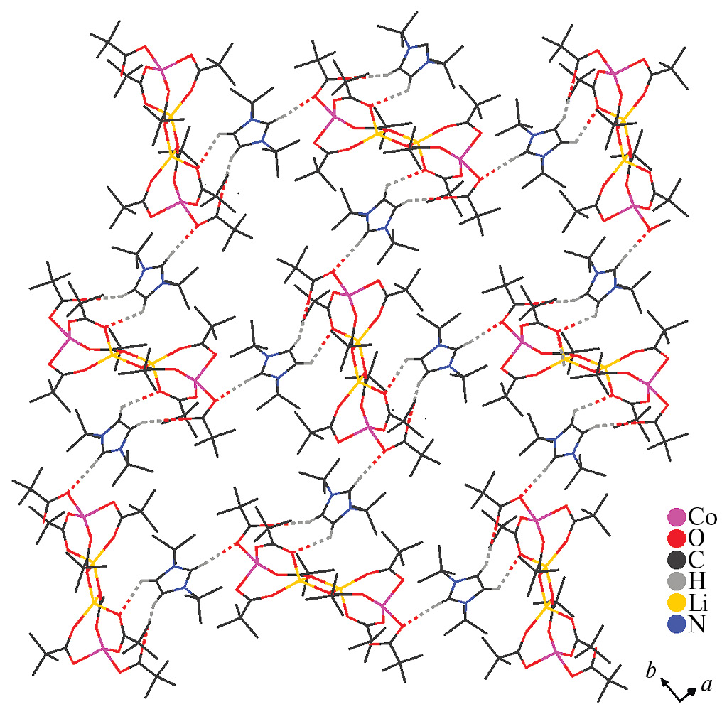 Между атомами кислорода карбоксилатных групп в [Co₂Li₂(Piv)₈]²⁻ и протонами имидазольного фрагмента внешнесферного органического катиона образуются контакты C–H…O: в I два вицинальных протона участвуют во взаимодействиях с атомами O(4) и O(6) одного фрагмента [Co₂Li₂(Piv)₈]²⁻, протон при атоме С(21) взаимодействует с атомом O(5) другого фрагмента [Co₂Li₂(Piv)₈]²⁻ (рис. 3, табл. 3); в II два вицинальных протона образуют H-связи с атомами O(1) и O(8), протон при атоме С(21) формирует H-связь с атомом O(1S) сольватной молекулы ТГФ (рис. 4, табл. 3).