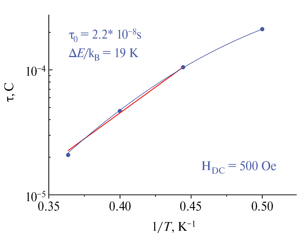 Для определения температурной зависимости времени релаксации в оптимальном магнитном поле проведены измерения изотерм частотных зависимостей динамической магнитной восприимчивости в интервале температур 2–2.75 K (рис. 7). Времена релаксации намагниченности определяли аппроксимацией зависимостей мнимой компоненты динамической магнитной восприимчивости от частоты с использованием обобщенной модели Дебая. На основании этих данных построены зависимости времени релаксации от обратной температуры τ(1/Т) для комплекса I (рис. 8).