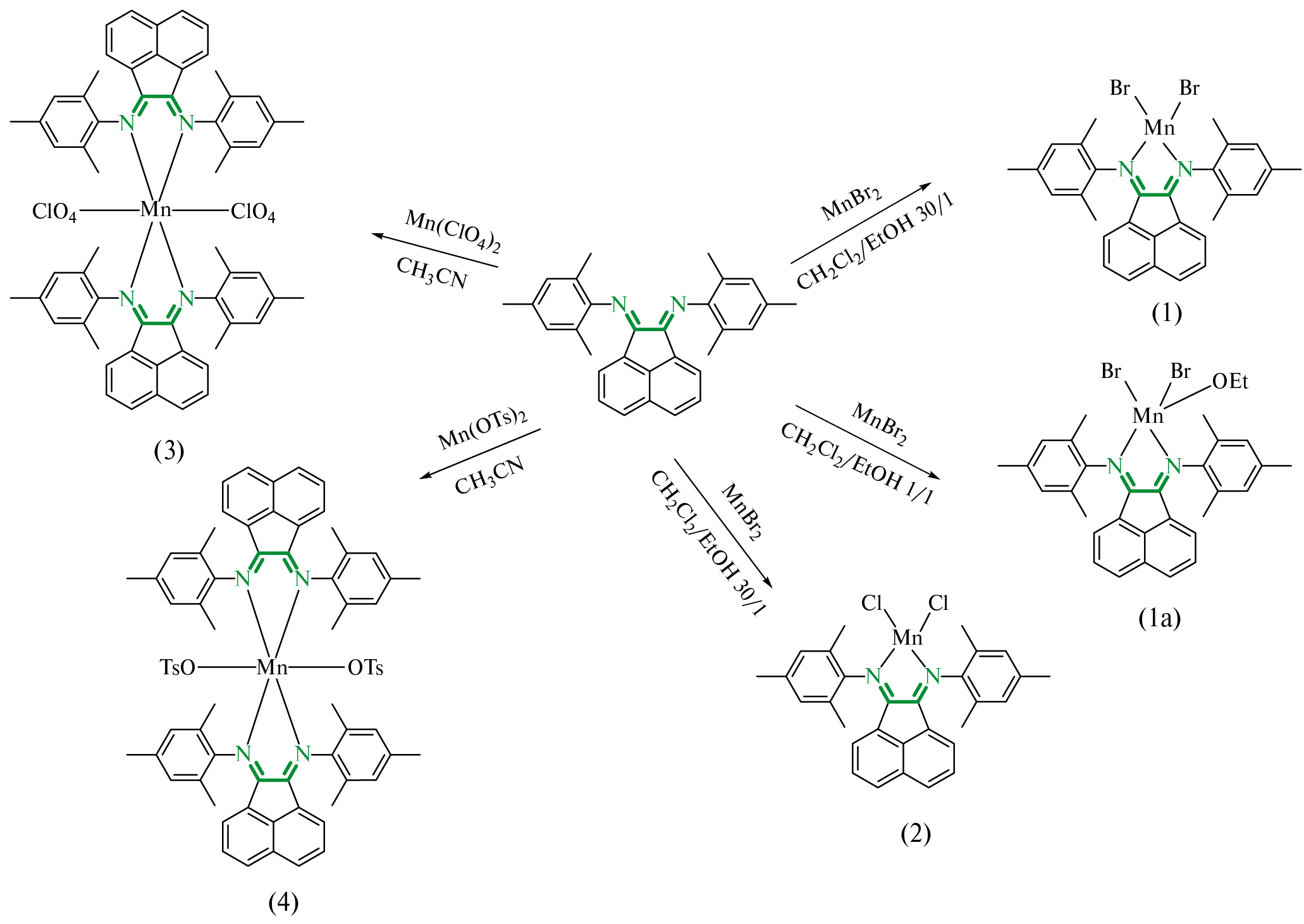 Цель настоящей работы — разработка методов синтеза комплексов марганца с N,N’-бис[(2,4,6-триметилфенил)имино]аценафтеном (Тmp-bian) (схема 3), а также установление их молекулярного и электронного строения и изучение фотолюминесцентных свойств.