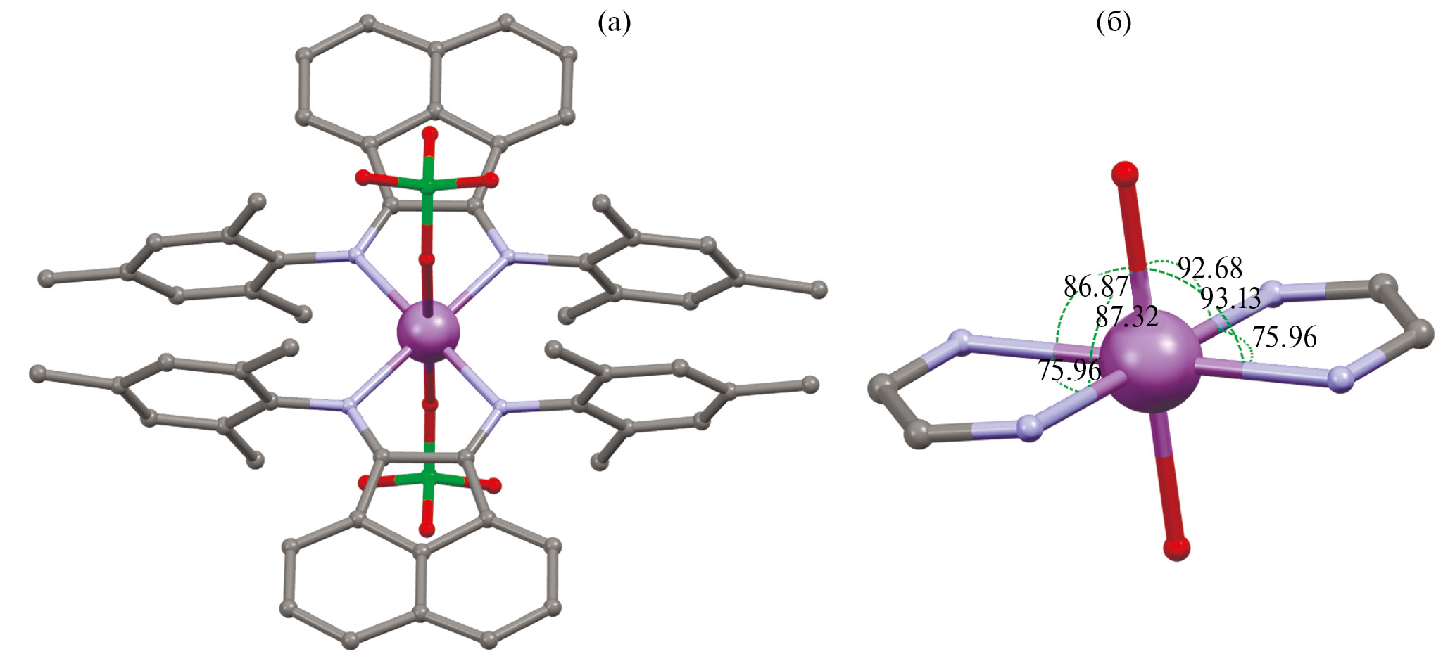 Для соединений I, Iа и III получены кристаллы надлежащего качества и проведен рентгеноструктурный анализ (табл. 1 и 2). В структуре комплекса I ион Mn(II) находится в слабоискаженном тетраэдрическом окружении, состоящем из двух анионов брома и двух атомов азота Tmp-bian (рис. 1). Угол ω между плоскостями N–Mn–N и Br–Mn–Br составляет 87,68°, что близко к значению ω = 90°, характерному для идеального тетраэдрического окружения. В случае комплекса Iа ион марганца находится в сильно искаженном квадратно-пирамидальном окружении, состоящем из двух анионов брома, двух атомов азота и атома кислорода координированной молекулы этанола (схема 4). Параметр τ5, характеризующий отклонение от идеальной геометрии квадратной пирамиды (КП) (τ5 = 0) или тригональной бипирамиды (ТБП) (τ5 = 1) и равный (α-β)/60 (α и β — наибольшие углы LML), составляет 0,44. Комплекс III содержит две координированных молекулы Tmp-bian; координационный полиэдр — слабоискаженный октаэдр, состоящий из четырех атомов азота двух Tmp-bian, находящихся в экваториальной плоскости, и двух атомов кислорода перхлоратных анионов, занимающих аксиальные положения (pис. 2).