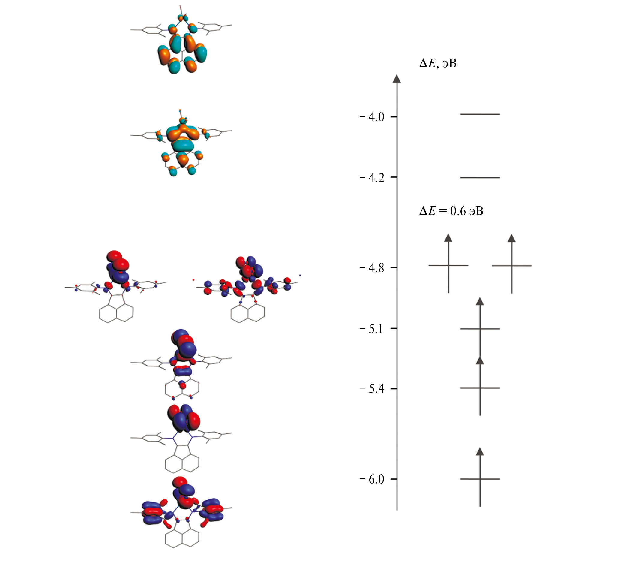 Для установления электронной структуры комплексов I и III выполнялись квантово-химические расчеты в рамках DFT. Полученные рентгеноструктурные данные использовались в качестве исходных моделей для дальнейшей оптимизации. C использованием неограниченного (unrestricted) метода расчетов были рассчитаны уровни энергии и формы граничных молекулярных орбиталей основного состояния молекул с пятью неспаренными электронами (pис. 3 и 4, табл. 3). Отсутствие мнимых частот указывало на нахождение системы в локальном минимуме на поверхности потенциальной энергии.