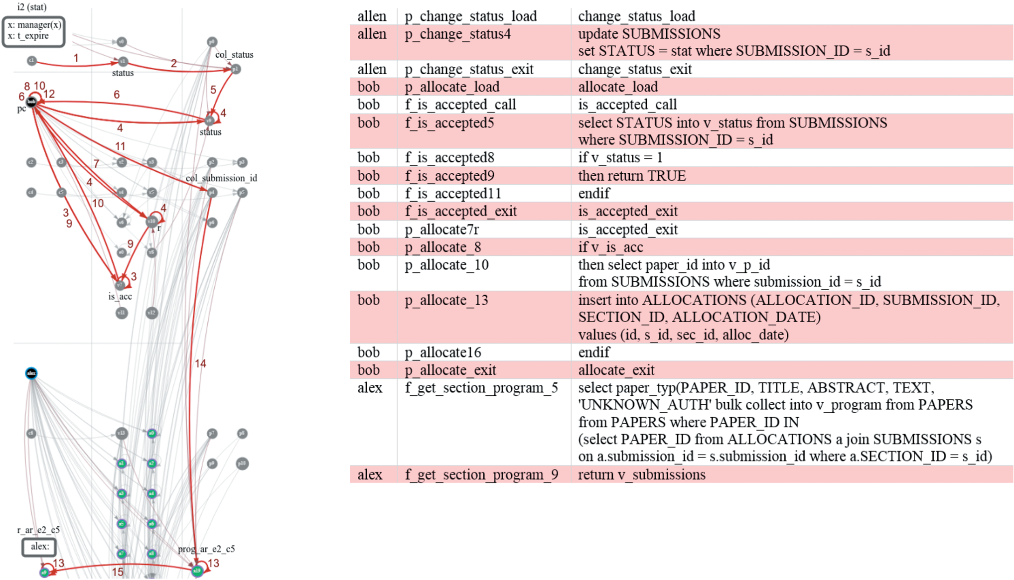 Formal proof of security measure effectiveness and computation security is vitally important for trust in critical information systems. It should be realized that formal security verification must be carried out at each infrastructural level (from the hardware level to the application level) in the process of system design. Currently, computation security analysis on the application level remains the major challenge as it requires complex labeling of computing environment elements. Traditionally, to solve this problem, information flow control (IFC) methods are employed. Unlike access control mechanisms widely used in modern operating systems (OSs) and database management systems (DBMSs), IFC has limited application in software design and mostly comes down to trivial taint tracking. This paper describes an approach to full-fledged implementation of IFC in PL/SQL program units with the use of the PLIF platform. In addition, a general scheme of computation security analysis for enterprise applications that work with relational DBMSs is considered. The key advantage of our approach is the explicit separation of functions between software developers and security analysts.