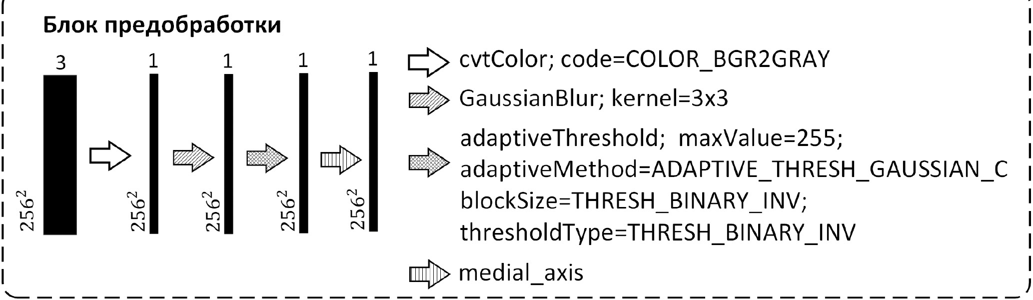Входное изображение разбивалось на базисные субизображения (в текущей версии 256 × 256 пикселов), которые брались за основу для предварительной обработки и процесса ручной разметки данных. Предобработка строилась на базе схемы последовательных преобразований RGB-изображения в бинарное (рис. 1).