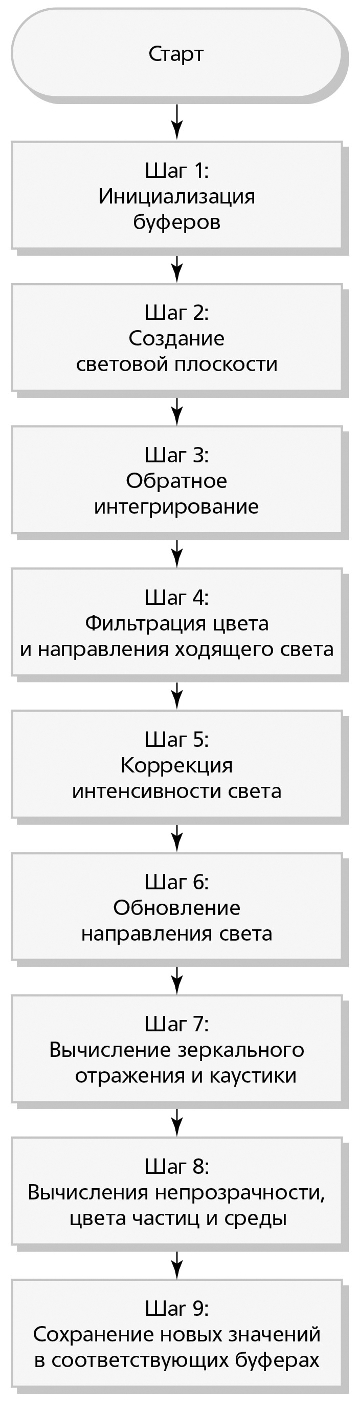 Входящее излучение смешивается с вкладами частиц и среды между двумя плоскостями. Направление света обновляется на основе градиента поля показателя преломления. Для каждого положения пикселя в текущем световом буфере вычисляем: