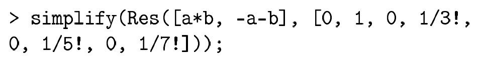 Замечание 1. Отметим, что такие задачи, как вычисление результанта двух многочленов или вычисление степенных сумм системы уравнений, тесно связаны с теорией симметрических функций. Современные системы компьютерной алгебры общего назначения, такие как Maplesoft Maple, Wolfram Mathematica и свободно распространяемая система SageMath, содержат пакеты, позволяющие эффективно проводить вычисления с симметрическими многочленами и на основе этого решать такие задачи, как вычисления результанта. Тем не менее ценность результатов, приведенных в теоремах и в том, что там предлагаются явные выражения для вычисления результанта через коэффициенты многочленов и их степенные суммы.