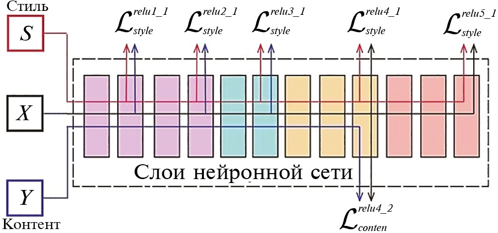Расчет контентных и стилевых потерь производится по представлениям изображений X, Y, S на промежуточных слоях сети VGG [7], обученной классифицировать изображения, на выборке ImageNet [8]. Причем для расчета контентных потерь используется один промежуточный слой k, а для расчета стилевых потерь – совокупность более ранних и более поздних слоев, как показано на рис. 2.