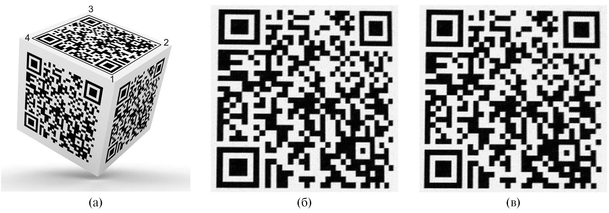 На рис. 2в представлен пример трансформации локализованного QR-кода, расположенного на верхней грани куба (рис. 2а). Сравнение качества способов трансформаций (2) и (3) делается в пользу второго, поскольку оно сохраняет исходное соотношение линейных размеров структурных элементов кода.
