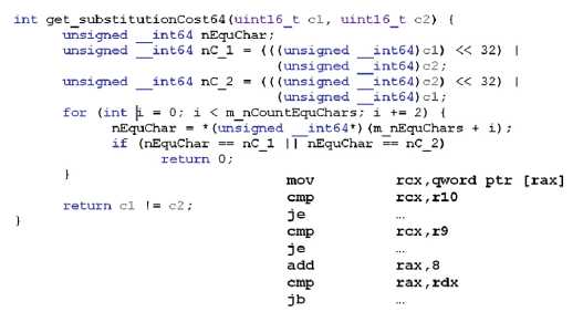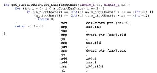 Первая оптимизация была связана с вычислением функции substCost(s, c). В реализации алгоритма создавались глобальные (соответствующие документу в целом) и локальные (соответствующие одному слову) таблицы эквивалентности символов, s ≠ c для которых substCost(s, c) = 0. При сравнении двух символов проводился поиск в таблице эквивалентности m_nEquChars, имеющий целый 32-разрядный тип, этих символов с учетом перестановки. При профилировании на компьютере Intel(R) Core(TM) i7–4790 CPU3.60 GHz, 16,0 GB, Windows 7 prof 64-bit с помощью ПО MVS Analizer и Intel VTune [15] функция substCost определилась как “горячая точка”. Исходный и ассемблерный коды представлены на рис. 1.