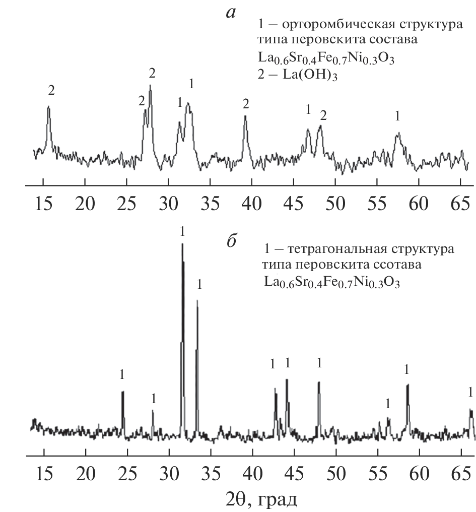 Finely dispersed mesoporous powders of the following composition are synthesized by the method of cocrystallization of nitrate salts with ultrasonic treatment: La1–xSrxNiO3–δ, La1–xSrxCoO3–δ, and La1–xSrxFe0.7Ni0.3O3–δ (x = 0.30; 0.40). Based on them, ceramic nanomaterials of the given composition with a coherent scattering region (CSR) of ~65–69 nm (1300°С) are obtained. Ceramics fired at 1300°C are single-phase and have a tetragonal and orthorhombic perovskite-type structure in the La2O3‒SrO‒Ni(Co,Fe)2O3–δ system. Solid solutions have mixed electron–ion conductivity with transfer numbers te = 0.98–0.90 and ti = 0.02–0.10. Ceramics with a tetragonal perovskite-type crystal structure exhibit higher electrical conductivity than materials having an orthorhombic perovskite-type crystal structure. According to their electrophysical properties related to the structural features of solid solutions, ceramic materials obtained based on them are promising as solid oxide cathodes for average-temperature fuel cells.