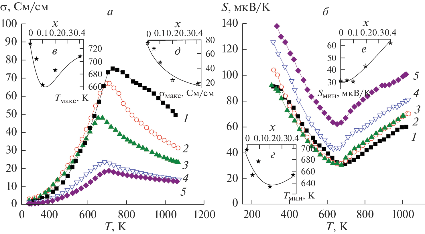 NdBa1 – xMgxFeCo0.5Cu0.5O5 + δ (0.00 ≤ x ≤ 0.40) double perovskites are synthesized by the ceramic method and their structure, oxygen nonstoichiometry (δ), and thermal and electrical transport properties are studied. NdBa1 – xMgxFeCo0.5Cu0.5O5 + δ compounds have a tetragonal structure (space group P4/mmm) and are semiconductors of the p-type, whose electrical conductivity characteristics at elevated temperatures changes to metal-like characteristics due to the release of oxygen from the samples (δ). The partial replacement of barium with magnesium in NdBaFeCo0.5Cu0.5O5 + δ leads to a decrease in the oxygen content (δ) in the solid solutions formed in this case, an increase in the size of their unit cell and the thermo-EMF coefficient, and a decrease in the thermal stability, linear thermal expansion coefficient, and electrical conductivity. The values of electrical transport energy, weighted mobility, and concentration of charge carriers in the studied materials are calculated.