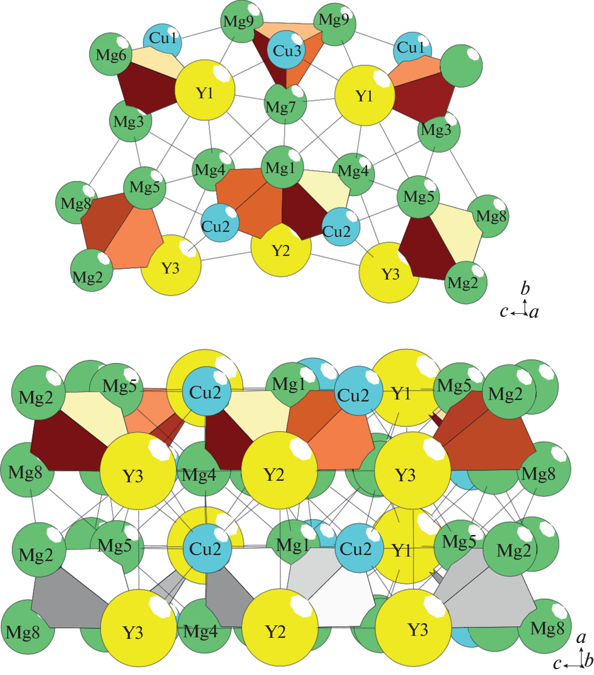 - Solokha P., de Negri S., Pavlyuk V., Saccone A. Inhomogeneous 2D linear intergrowth structures among novel Y–Cu–Mg ternary compounds with yttrium/copper equiatomic ratio // Solid State Sciences. 2009. V. 11. P. 801–811.