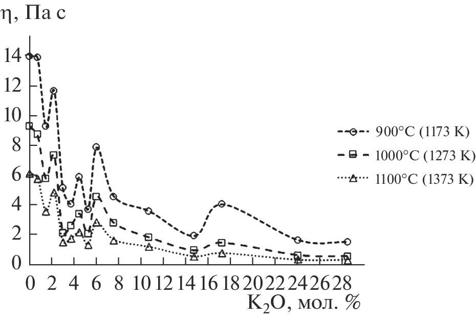 Вязкость калиевоборатных расплавов измерена в интервале температур 918–1699 K с помощью вибрационного вискозиметра. Содержание оксида калия в расплавах варьировалось от 0.74 до 28.46 мол. %. С использованием конфигурационно-активационной модели рассчитаны параметры энергии активации вязкого течения стеклующихся расплавов (конфигурационная энергия активации (εh) и энергия переключения мостиковых кислородных связей (U∞)) для двух температурных интервалов 918–1400 K и 1400–1699 K. Методом дифференциальной сканирующей калориметрии определена температура стеклования (Tg) расплавов, построена концентрационная зависимость температуры стеклования от содержания оксида калия в расплаве.