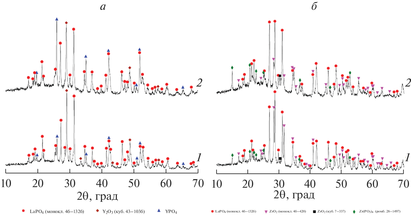 Рассмотрены два подхода к синтезу наноразмерных порошков-прекурсоров 0.5LaPO4·nH2O–0.5ZrO(OH)2 и 0.5LaPO4·nH2O–0.5Y(OH)3 для получения керамических композитов 0.5LaPO4–0.5ZrO2 и 0.5LaPO4–0.5Y2O3. В первом случае золь-гель синтез компонентов (LaPO4·nH2O, ZrO(OH)2 или Y(OH)3) проводили раздельно обратным осаждением. Во втором случае использовали обратное осаждение, но без раздельного получения золей компонентов. Проведено сравнение результатов синтеза методом РФА, сравнение термического поведения порошков-прекурсоров методом ДСК/ТГ, а также величин микротвердости керамических композитов 0.5LaPO4–0.5ZrO2 и 0.5LaPO4–0.5Y2O3.