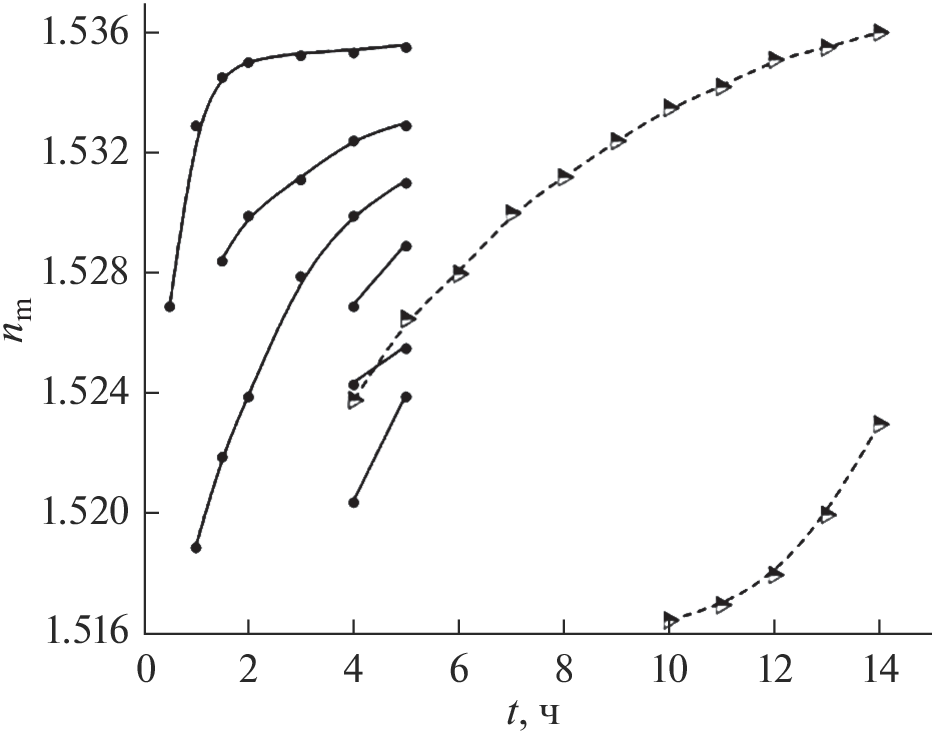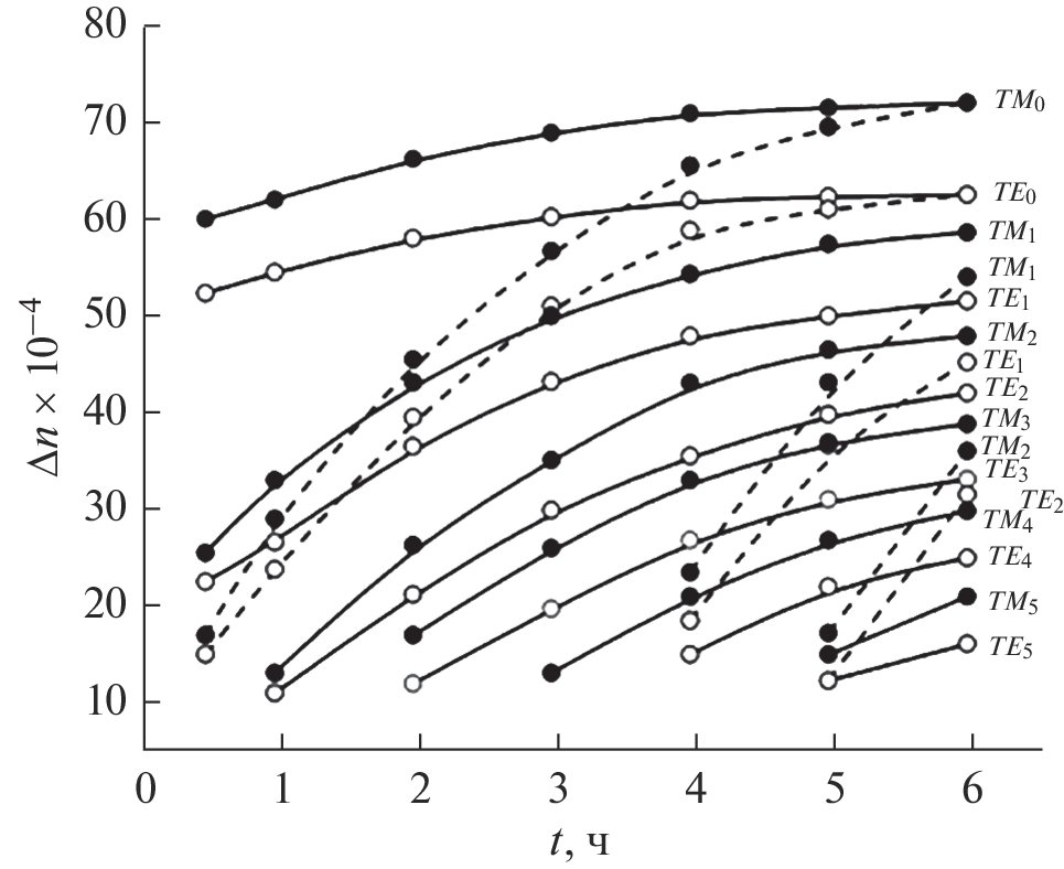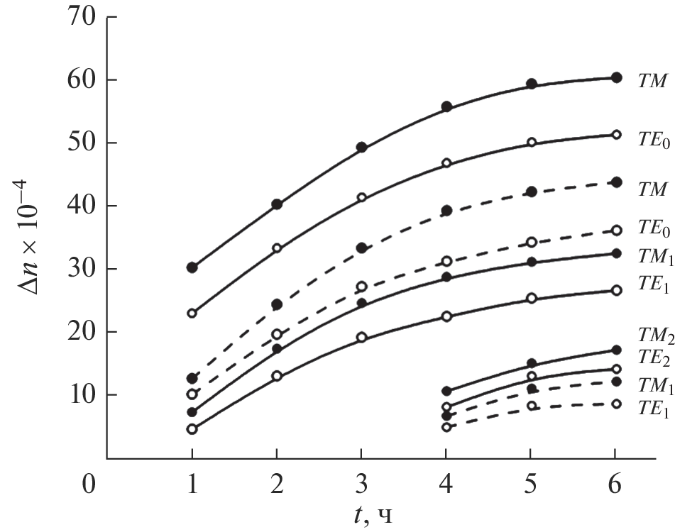 Произведена низкотемпературная термообработка стекла К-8 при температурах 350–500°С в щелочных расплавах солей NaNO3 и CsNO3 как в поле гамма-излучения источника 60Со при мощности дозы 3000 Р/с, так и вне поля. Под влиянием терморадиационной обработки вследствие ионообменной диффузии \({\text{Na}}_{{{\text{{с}{т}{е}{к}{л}{а}}}}}^{ + }\) ↔ \({\text{Cs}}_{{{\text{{р}{а}{с}{п}{л}{а}{в}}}}}^{ + }\) в поверхностном слое стекла создавались механические сжимающие напряжения, которые приводили к формированию волноводного слоя заданной толщины, увеличению прироста показателя преломления, количества волноводных мод и глубины волноводного слоя.