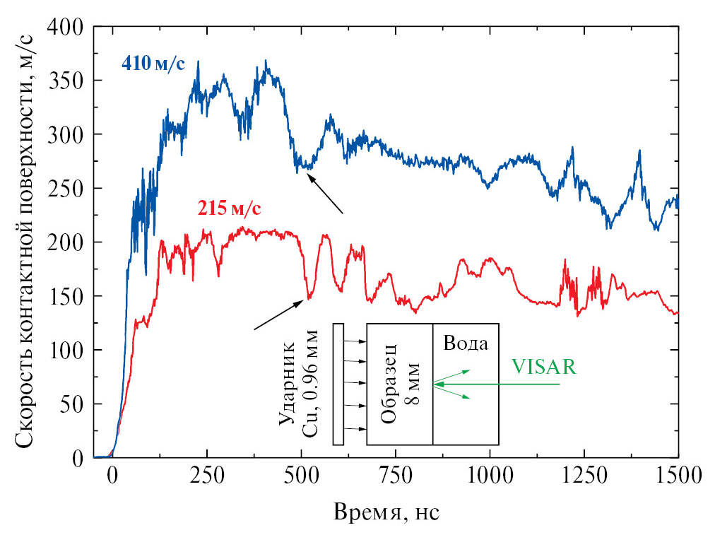Для измерения динамической (откольной) прочности на растяжение нагружение исследуемых образцов осуществлялось медными ударниками толщиной 0.95 мм, разогнанными до скоростей 215±10 м/с и 410±10 м/с с помощью пневматической газовой пушки. Максимальные напряжения сжатия в образцах при этих условиях нагружения составили 5.5 и 9.3 ГПа, что не превышало динамического предела упругости, обсуждаемого ниже. Регистрация профилей скорости контактной поверхности «образец — вода» проводили с помощью лазерного допплеровского измерителя скорости VISAR [11]. Отражение лазерного излучения осуществлялось от алюминиевой фольги толщиной 7 и 20 мкм, наклеенной на образец.