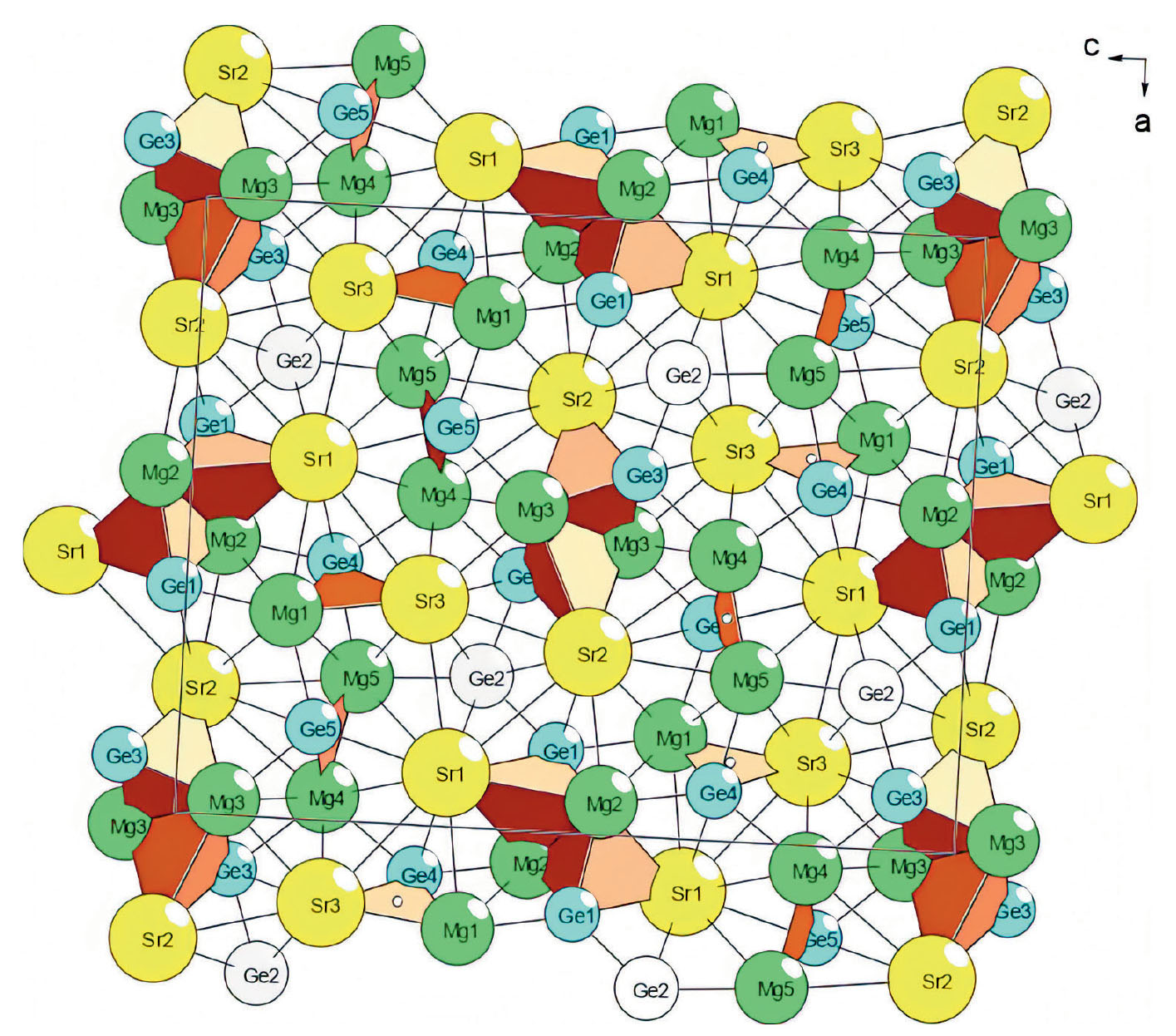 Наиболее кристаллохимически сложное семейство Sr-содержащих интерметаллидов состоит из Sr12Mg20Ge20-oP52 (Sr12(Mg17.9Li2.1) Ge20-oP52), Sr12Mg20Si20-oP52 (Sr12Mg17.8Li2.2Si20-oP52), Eu12Mg20Ge20-oP52 и Eu12Mg20Si20- oP52 ([3–14], табл. 1). В элементарной ячейке Sr12Mg20Ge20-oP52 находятся 52 атома, и для 13 кристаллографически независимых атомов последовательность Вайкоффа имеет вид c13. В частных позициях пространственной группы Pnma в двух плоскостях m (010) на высоте ¼ и ¾ находится по 26 атомов. Координационные числа трех атомов Sr — 17, 17, 15, пяти атомов Mg — 12, пяти атомов Ge — 9.