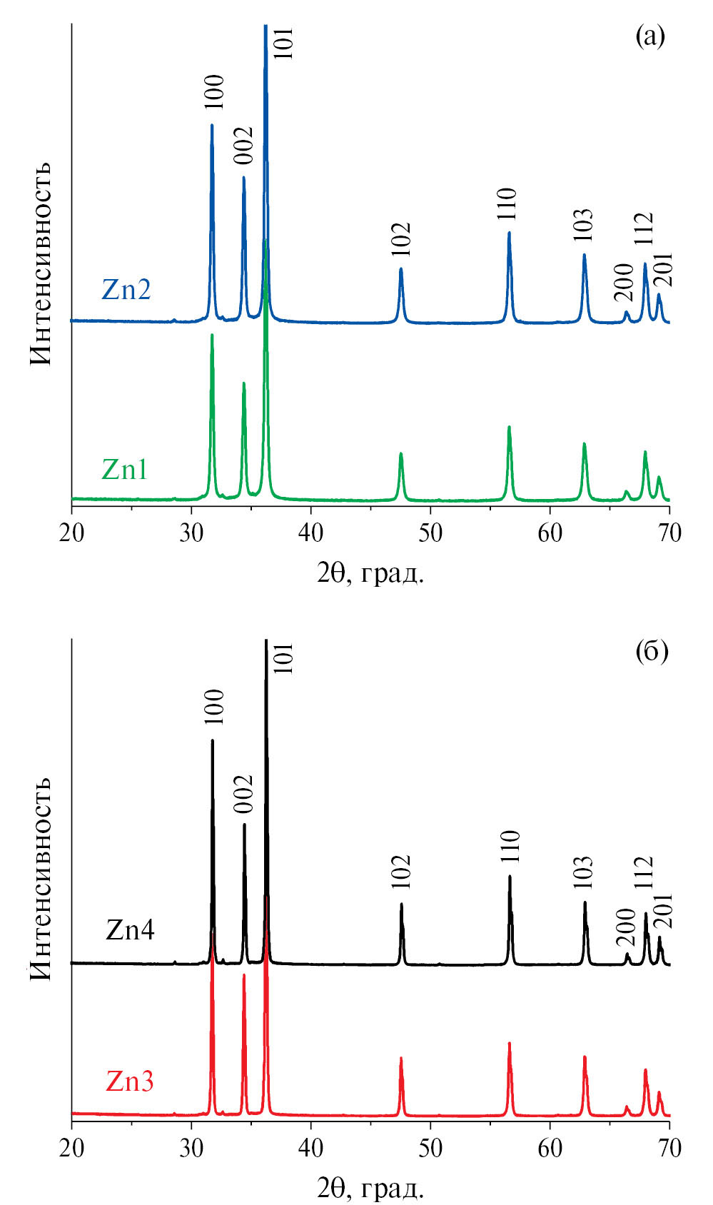 На рентгенограммах синтезированных порошков все наблюдаемые пики принадлежат гексагональным кристаллам ZnO со структурой вюрцита (рис. 2). Соотношения интенсивностей различных пиков на дифрактограммах одинаково для образцов Zn1, Zn3 и близко к стандартным значениям (PDF card 01-070-8072), что свидетельствует об отсутствии текстуры в полученных порошках. Средние размеры кристаллов в образцах Zn1, Zn2, Zn3 и Zn4 составили 26±3; 30±4; 48±8 и 58±12 нм соответственно. Полученные данные свидетельствуют о существенном влиянии добавок ПВП на размер формирующихся кристаллов оксида цинка.