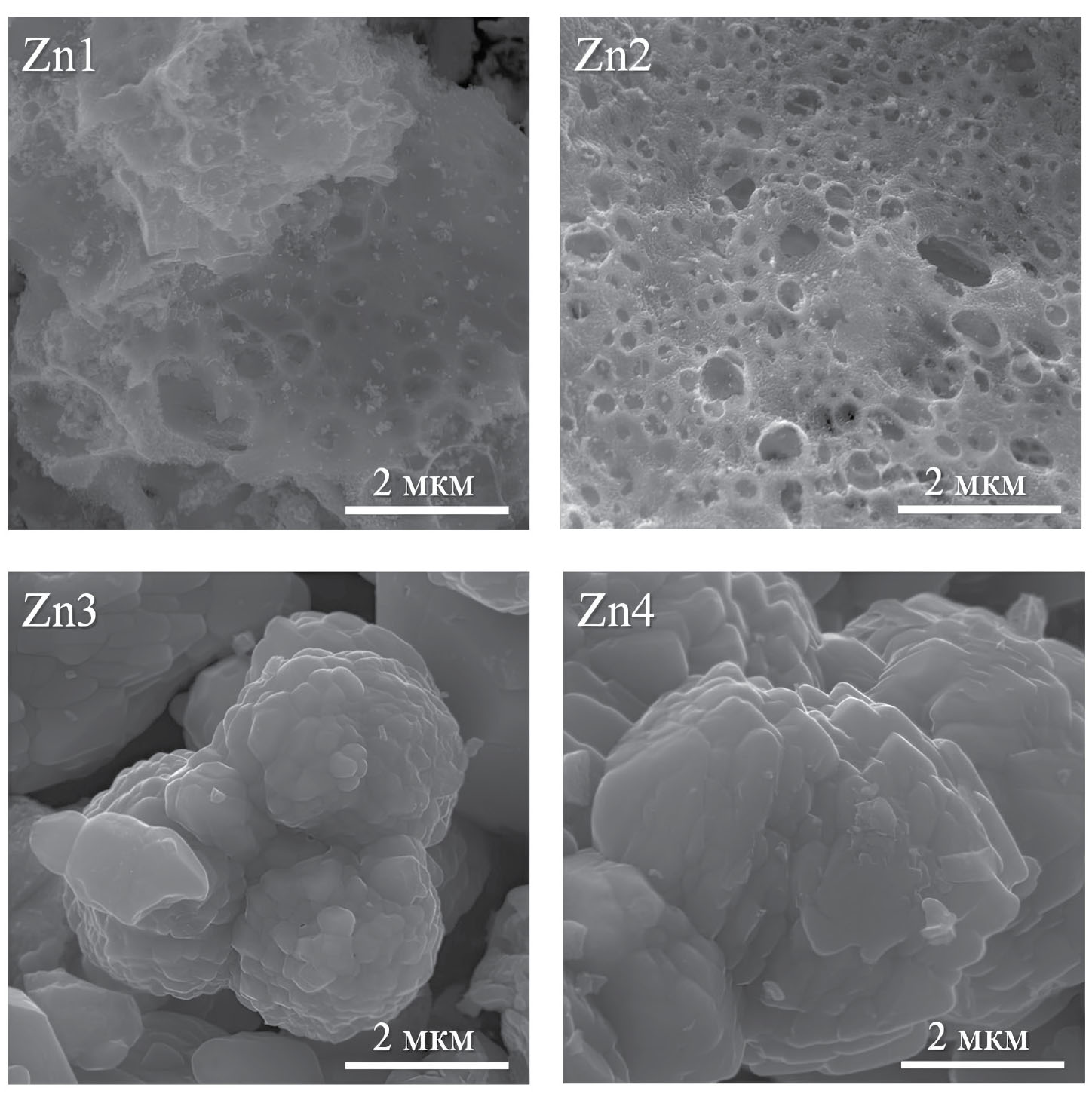Электронно-микроскопические снимки полученных порошков ZnO иллюстрируют влияние добавки ПВП на их морфологию (рис. 3). Электронно- микроскопические снимки показали, что порошки Zn3 и Zn4, полученные путем термического разложения нитрата цинка, состоят из плотных частиц, формирующих агрегаты микронного размера. Образцы Zn1 и Zn2, синтезированные с применением полимерно-солевого метода, обладают развитой губчатой структурой поверхности, которая формируется за счет обильного выделения газов на стадии термообработки исходных материалов.