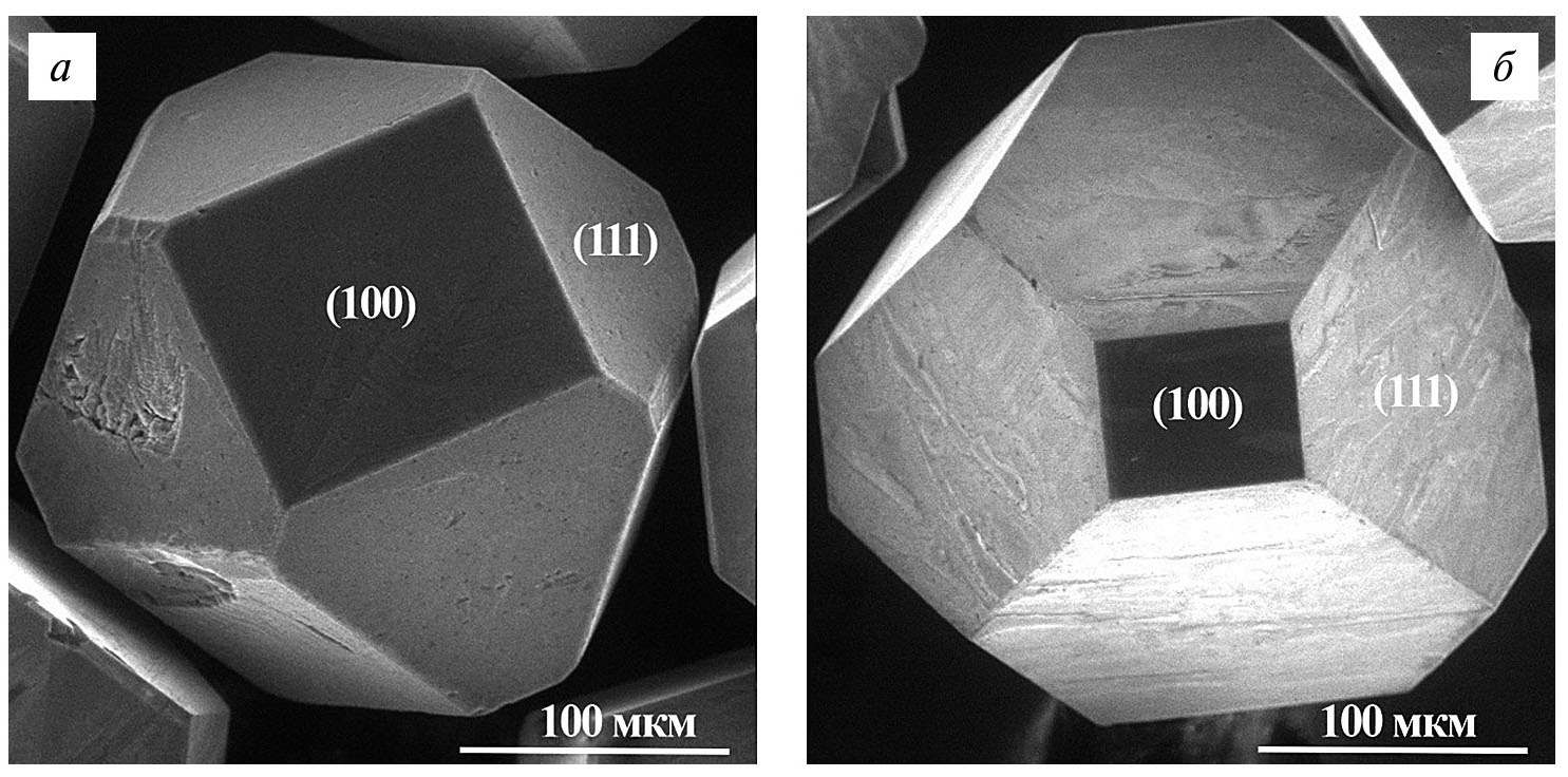 Рис. 2. Микрофотографии SEM исходных частиц алмаза, имеющих форму кубооктаэдра (а) и усеченного октаэдра, с наиболее развитыми кубическими {100} и октаэдрическими {111} гранями