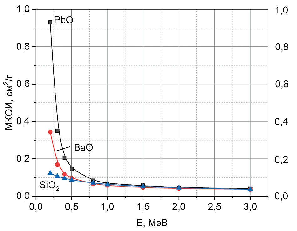 Данные табл. 1 представлены графически на рис. 1. Видно, что сильные различия в значениях МКОИ у SiO2 (а значит, и у B2O3, Na2O, K2O, CaO и Al2O), BaO и PbO наблюдаются действительно только в диапазоне энергий квантов от 0.2 до примерно 1.0 МэВ, тогда как при более высоких энергиях квантов ВФИИ вплоть до 3.0 МэВ зависимости МКОИ всех оксидов практически одинаковы. Это означает, что при значениях Е, лежащих в диапазоне от 1.0 до 3.0 МэВ, значения МКОИ кроновых стекол (на основе (SiO2, B2O3, Na2O, K2O, CaO и Al2O3) должны быть близки к таковым для стекол с BaO и PbO, т. е. для флинтовых стекол.