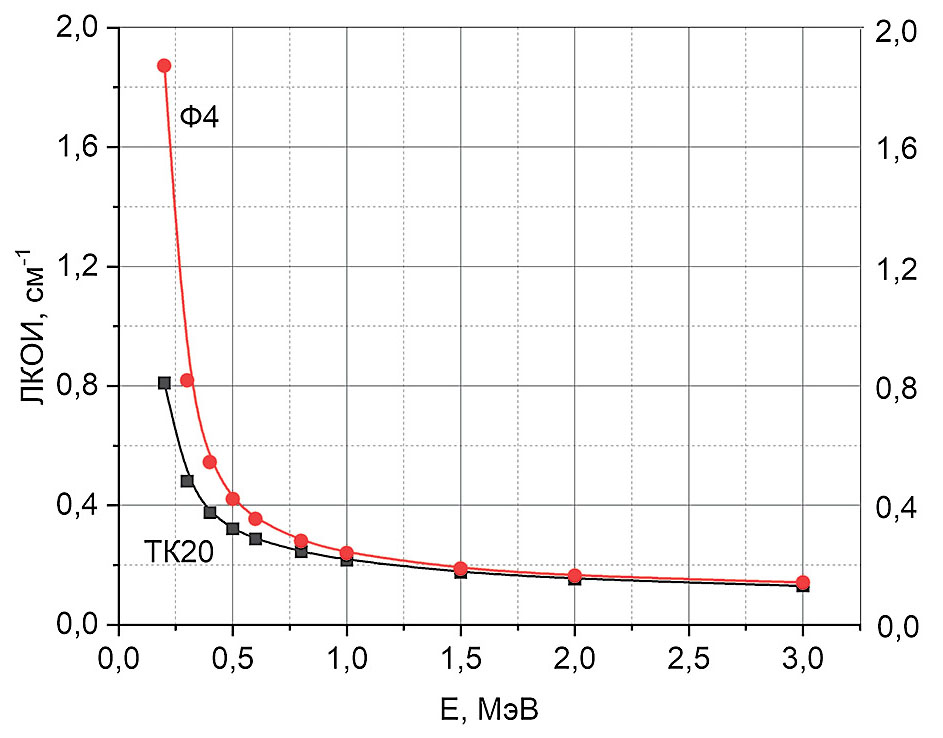 Как следует из рис. 2–5, ход зависимостей ЛКОИ стекол от энергии квантов ВФИИ в области, превышающей примерно 1.25 МэВ (1.5 МэВ для тройки стекол ТФ1, ТФ3 и СТК19), практически совпадает. А вот в более низкоэнергетической области значения ЛКОИ сильно возрастают с уменьшением Е, причем тем значительнее, чем выше плотность стекол. При этом возрастание ЛКОИ у флинтовых стекол выражено значительно сильнее, чем у стекол кроновой группы. Эти данные убедительно свидетельствуют о том, что в области энергий квантов, превышающих приблизительно 1.0 МэВ, не следует рассчитывать на то, что флинтовые стекла будут эффективнее ослаблять излучение, чем стекла кроновой группы с близкой плотностью. Поэтому для того, чтобы кроновое стекло на входе СРЗО достаточно сильно ослабило излучение, надо выбирать стекло с более высокой плотностью, чем у стекол К208 или К108, плотности которых равны 2.51 и 2.52 г/см3 соответственно. Разумеется, выбор кроновых стекол должен проводиться с учетом их РОУ [9–11]. С этой точки зрения, казалось бы, могли подойти стекла ТКН1 (3.63 г/см3) и ТК216 (3.56 г/см3) при высоких радиационных нагрузках, а при умеренных — ТК116 (3.52 г/см3) или ТК120 (3.58 г/см3), у которых плотность более чем на 1.0 г/см3 превышает таковую стекол К208 (К108). Однако стекла ТК116 и ТК120 сильно уступают стеклам ТКН1 и ТК216 по РОУ [10, 11]. Поскольку кратности ослабления излучения у СРЗО обычно бывают очень высокими (105–106), более предпочтительными по РОУ представляются стекла К208, ТКН1 и ТК216.