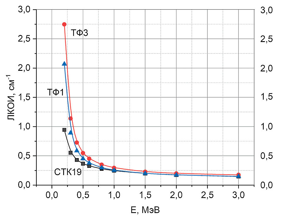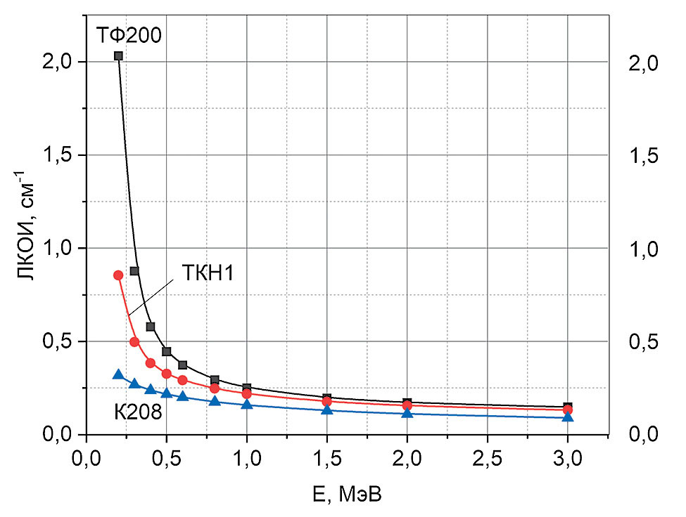 На рис. 6 представлены графики зависимостей ЛКОИ стекол ТФ200 и ТКН1 от энергии квантов ВФИИ. Для сравнения приведен также аналогичный график и для стекла К208. Видно, что стекло К208 заметно уступает стеклу ТКН1 по значениям ЛКОИ во всем диапазоне Е от 0.2 до 3.0 МэВ.