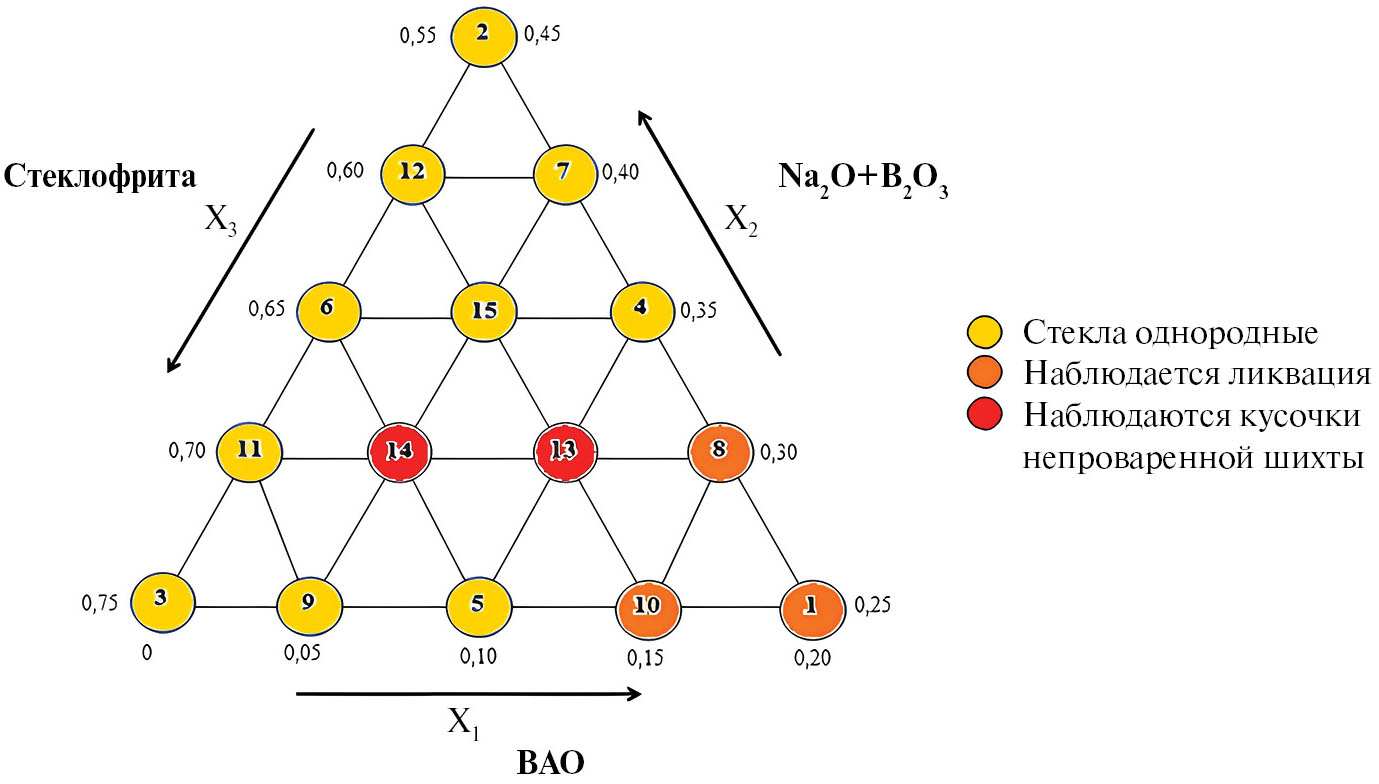 Метод математического планирования на симплексе успешно применялся во многих исследованиях. Например, в работе [7] проведено подробное исследование свойств фосфатных и борофосфатных стекол. Показаны преимущества борофосфатного стекла по сравнению с фосфатным: более высокая степень включения, сокращение температурного интервала варки, уменьшение чувствительности к составу иммобилизируемых отходов и изменению температуры выработки и слива.