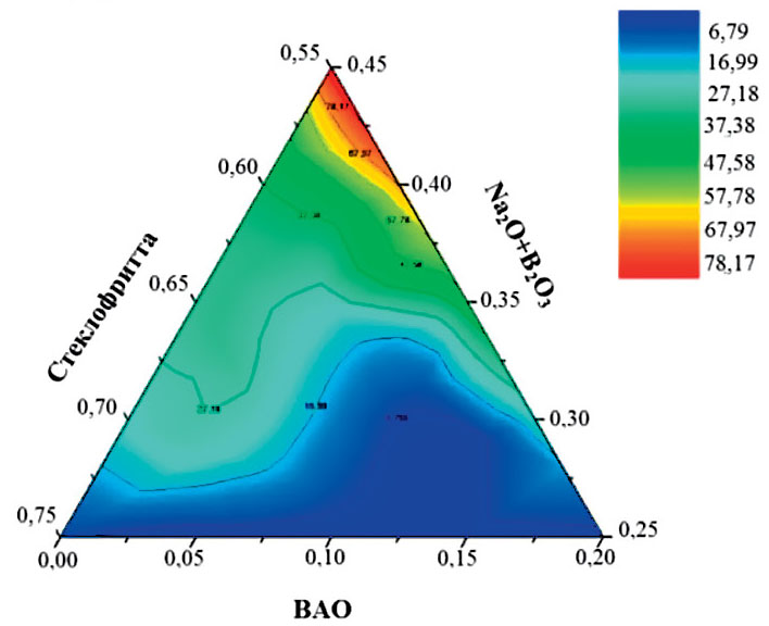 Из рис. 5 и 6 следует отметить, что химически устойчивые составы по показателям скорости и степени выщелачивания натрия отмечаются в области, в которой массовая доля смеси оксидов натрия и бора составляет от 25 до 32.5%, стеклофритты — от 62.5 до 75%, оксидов имитатора высокоактивных отходов — от 0 до 20%.