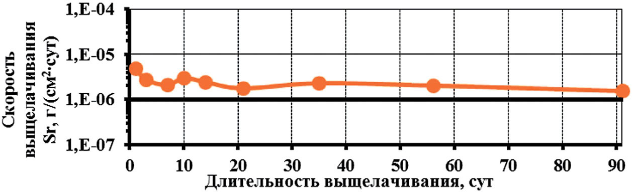 Скорость выщелачивания стронция из закаленного стекла состава № 13 отклоняется от нормативной величины (1∙10–6 г/(см2∙сут)) и составляет 5.0∙10–6 г/(см2∙сут). По истечении 7 сут и более скорость выщелачивания стронция постепенно приближается к граничному значению, степень выщелачивания за 91 сут — 2.1%.