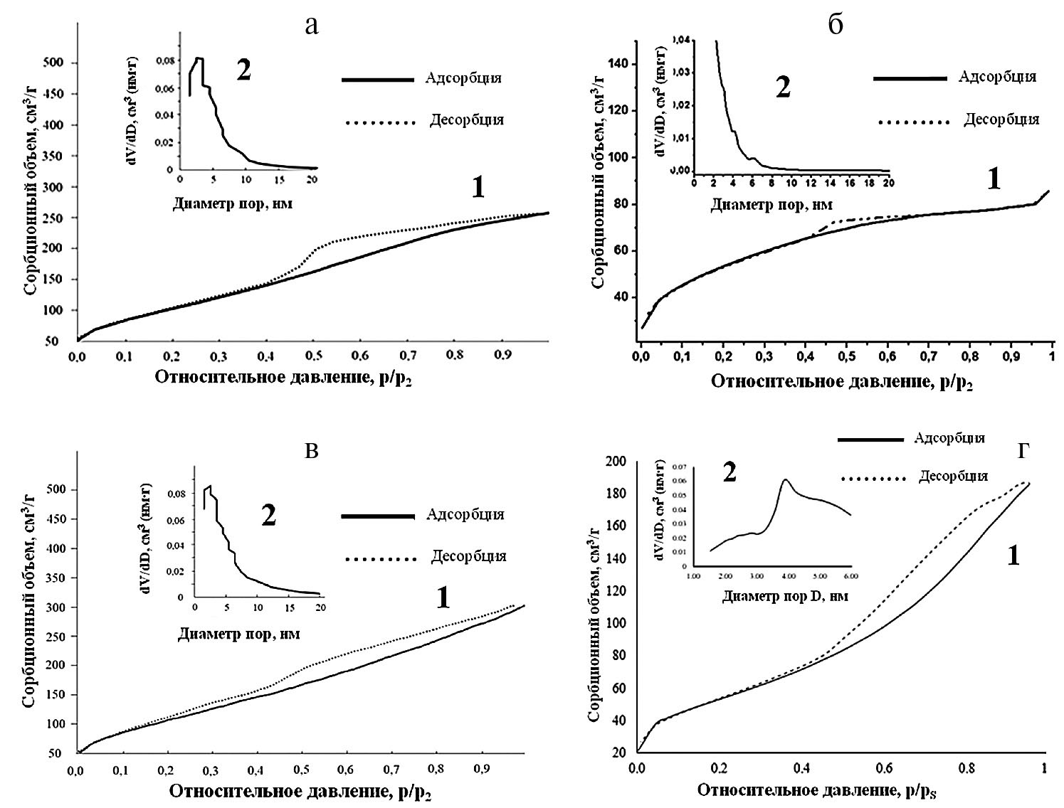 Рис. 1. Изотермы адсорбции-десорбции (1) и дифференциальные кривые распределения пор по размерам (2) для ксерогелей составов (ZrО2)088(СeO2)0.12 (а), (ZrО2)0.97(Y2О3)0.03 (б), (ZrO2)0.955(Y2О3)0.045 (в), 80 мол. % (ZrO2)0.88(CeO2)0.12–20 мол. % Al2O3 (г)