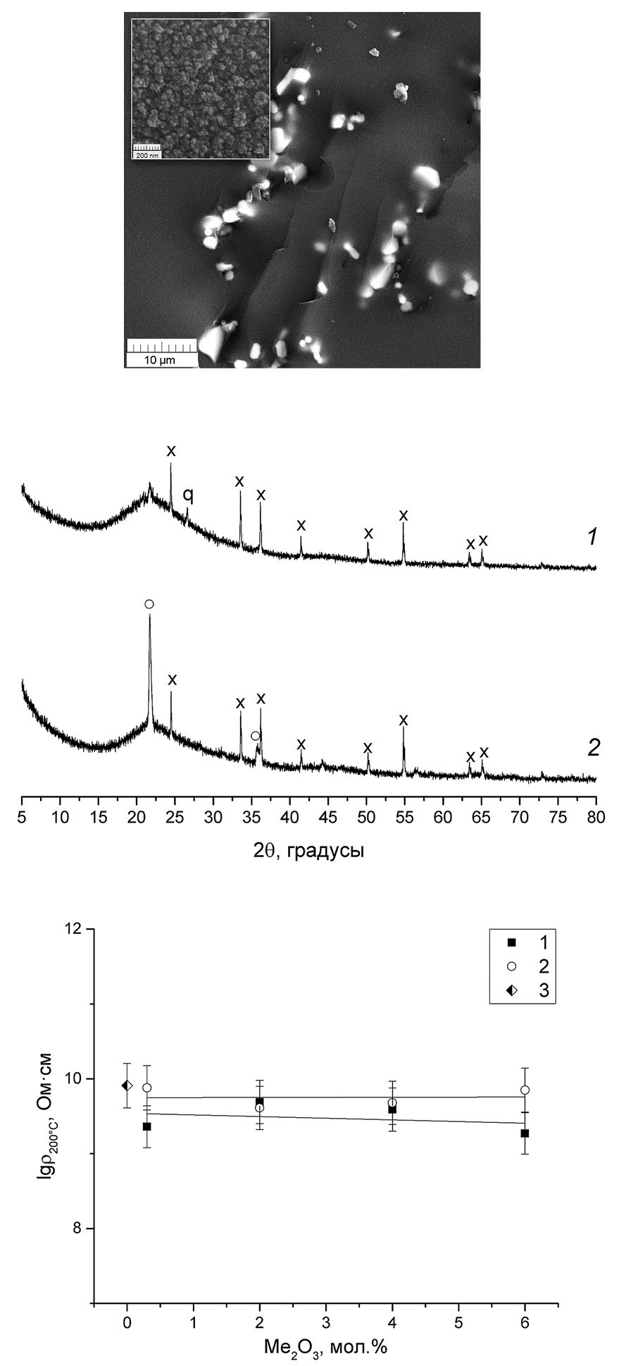 Рис. 1. (а) — микрофотография стекла 8/70-2, термообработанного при 550°C в течение 48 ч. Врезка — съемка с помощью детектора вторичных электронов (рельеф). Увеличение — 100 тыс. раз. Фон — съемка в режиме контраста по среднему атомному номеру. Увеличение — 5 тыс. раз; (б) дифрактограммы стекла 8/70-2 после отжига (кривая 1) и термообработанного при 550°C в течение 48 ч (кривая 2). Обозначения на рисунке соответствуют кристаллическим фазам: x — α-Cr2O3 (85-0869); q — кварц (86-1630), пустой круг — кристобалит (82-1410); (в) зависимость логарифма эффективного электрического сопротивления при температуре 200°C от содержания Me2O3 (Me = Cr, Fe) в мол.% по синтезу для исследованных стекол, термообработанных по режиму: 1 — хромсодержащие стекла, термообработанные при температуре 550°C, 48 ч; 2 — железосодержащие стекла, термообработанные при температуре 550°C, 144 ч; 3 — стекло 8/70, термообработанное при температуре 550 °C, 144 ч