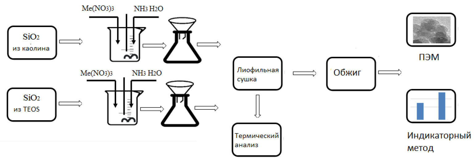По первому способу (рис. 1) оксид кремния получали из каолина. Навеску каолина сплавляли с карбонатом калия при 900 °С. Далее полученный сплав выщелачивали соляной кислотой. Осадок SiO2 белого цвета промывали водой, высушивали и прокаливали при 1000 °С. В химический реактор загружали прокаленный оксид кремния, добавляли воду, 1 % раствор агар-агара и капельно при перемешивании вводили 0.1 М раствор нитрата лантана и гидроксида аммония. Полученные гели промывали, сушили лиофильной сушкой, прокаливали при 750 °С в течении 4 ч.