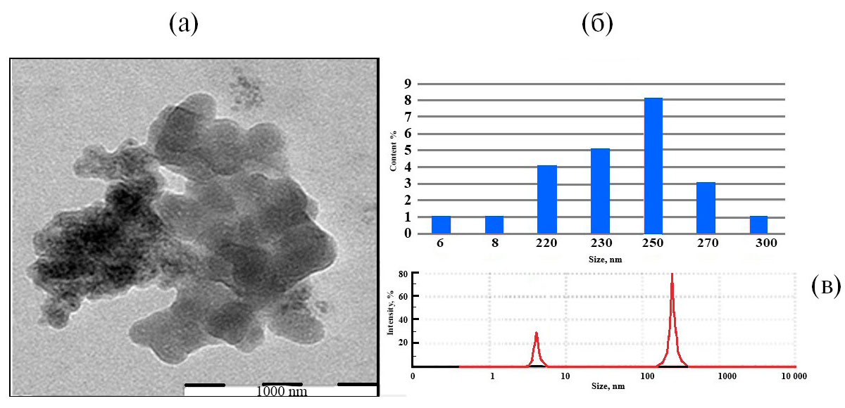 Рис. 2. Просвечивающая электронная микроскопия (ПЭМ) образца La2O3 ∙ SiO2, полученного из каолина (а); гистограмма распределения частиц по размерам (б); гистограмма распределения частиц по размерам из метода DLS (в).