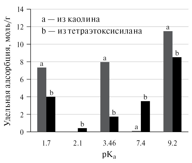 На диаграмме распределения центров адсорбции индикаторов на поверхности исследуемых систем (рис. 4, табл. 2) присутствуют 3 основных участка, описывающих активные центры: бренстедовские кислотные (pKa1.7), слабокислотные (pKa3.46), а также основные (pKa9.2) центры. При этом максимальную удельную адсорбцию наблюдаем у образца, полученного из каолина. Образец, полученный из тетраэтоксисилана, обладает меньшей интенсивностью центров адсорбции.