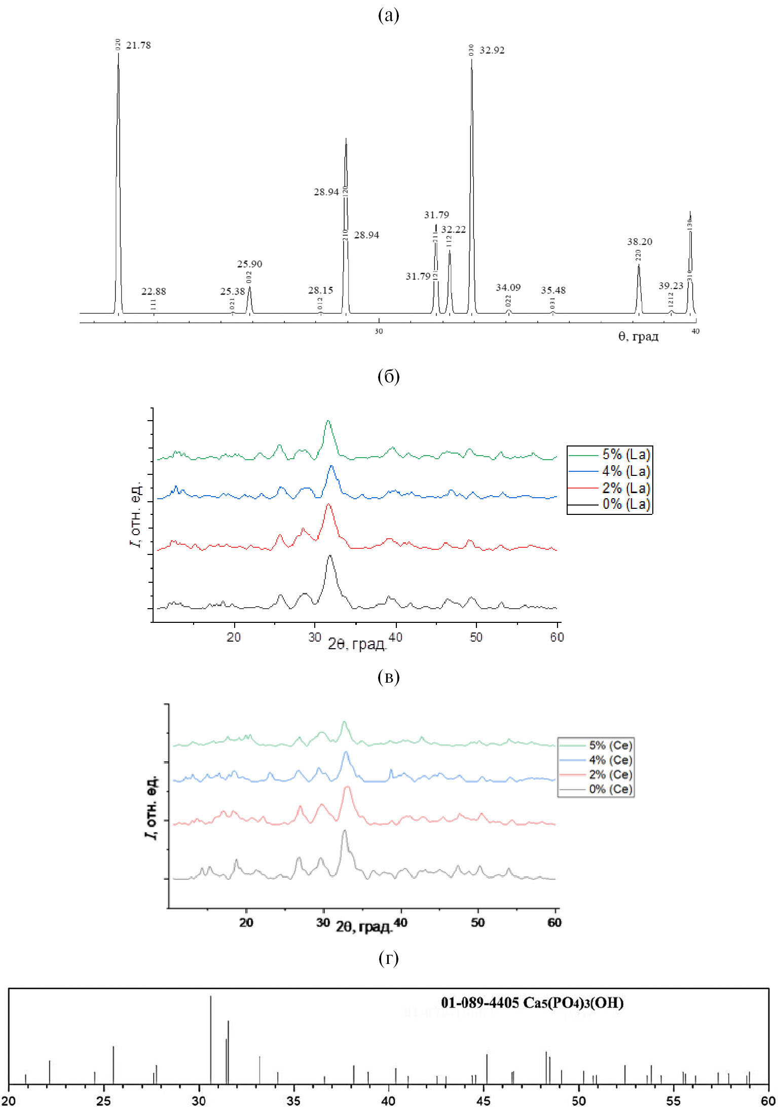 Исследование образцов методом РФА показало присутствие гидроксиапатита в качестве основной фазы в составе всех образцов. На рис. 1(а,г) представлены для сравнения дифрактограммы ГА без добавок, а также для образцов, которые были синтезированы с добавлением ионов La3+ (рис. 1(б)). На дифрактограмме выявлено наличие рефлексов при 25.8° (002), 28.9° (210), 31.8 (211), 32.9° (300), 34.0° (202), что подтверждает наличие фазы гидроксиапатита для образца без РЗЭ. Видно, что дифрактограммы для образцов с добавлением ионов La3+ в сравнении с дифрактораммой для ГА без добавления ионов La3+ имеют схожий вид, но при этом наблюдается смещение характеристических углов в сторону больших значений. Такое явления может свидетельствовать о процессе изоморфного замещения в структуре ГА ионов Ca2+(1.06 Å) на ионы La3+(1.22 Å), и как следствие изменению кристаллической решетки и ее параметров. На рис. 1(в) продемонстрированы дифрактораммы для ГА, синтезированного без добавления ионов Ce3+, а также с добавлением ионов Ce3+. Дифрактограммы имеют схожий вид, можно сделать вывод, что они однофазны. Для дифрактограмм образцов, синтезированных с добавлением ионов Ce3+ по сравнению с дифрактограммой для ГА без РЗЭ наблюдается смещение характеристических углов, вследствие этого можно предположить, что в фазах гидроксиапатита происходит процесс замещение ионов Ca2+(1.06 Å) на ионы Ce3+(1.18 Å).