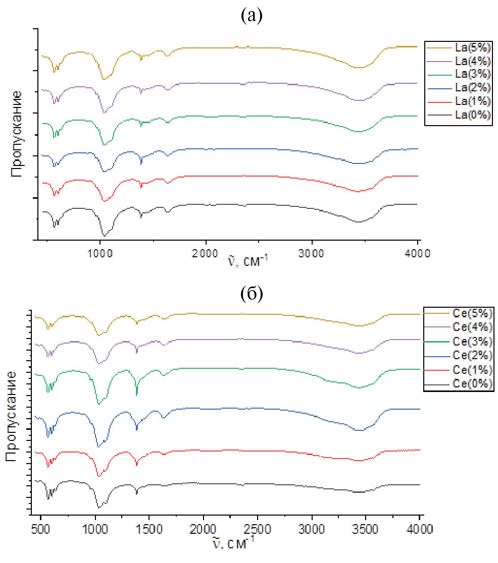 Рис. 2. ИК-спектры синтезированных образцов гидроксилапатита: с добавлением ионов La3+ (а), с добавлением ионов Ce3+ (б).