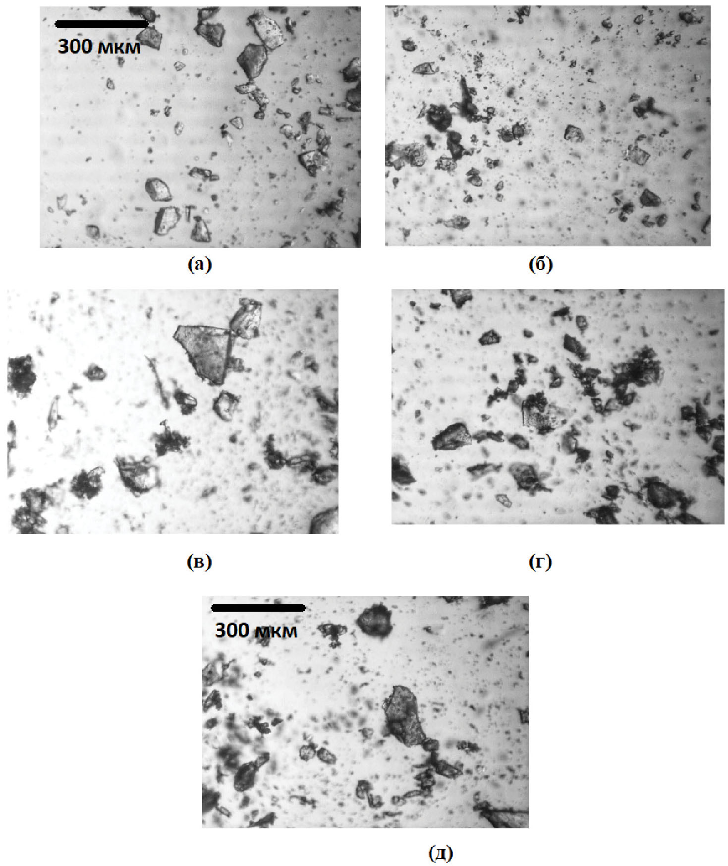 Полученные в ходе синтеза твердые фазы исследовались методом оптической микроскопии для изучения их морфологии. На микрофотографиях (рис. 3а) видно, что агрегаты ГА без ионов РЗЭ имеют грани неправильной формы, наблюдаются острые сколы, но при этом частицы имеют четкий контур и разброс по размерам. Для образцов с содержанием ионов РЗЭ, как правило, контур агрегатов принимает менее четкий вид по сравнению с гидроксиапатитом, синтезированным без добавления ионов РЗЭ. Менее четкий контур проявляется у образцов с 5% добавкой (рис. 3в, д).