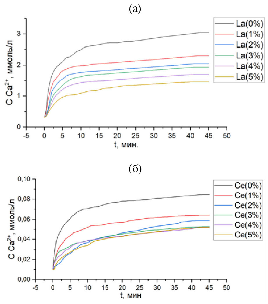 При исследовании растворимости синтезированных образцов в соляной кислоте (рН = 2.0), которая моделирует активную резорбцию, наблюдаются различные зависимости. Насыщение ионами кальция раствора происходит на 10 минуте. Так, образцы гидроксиапатита, допированные ионами La3+, растворяются с меньшей скоростью по сравнению с ГА без добавки РЗЭ (рис. 5(а)), а образцы ГА с добавлением 1, 2, 3% Ce3+ обладают большей скоростью растворения по сравнению с гидроксиапатитом без добавок. Исходя из этого, присутствие ионов Ce3+ в структуре ГА может способствовать резорбции материала.