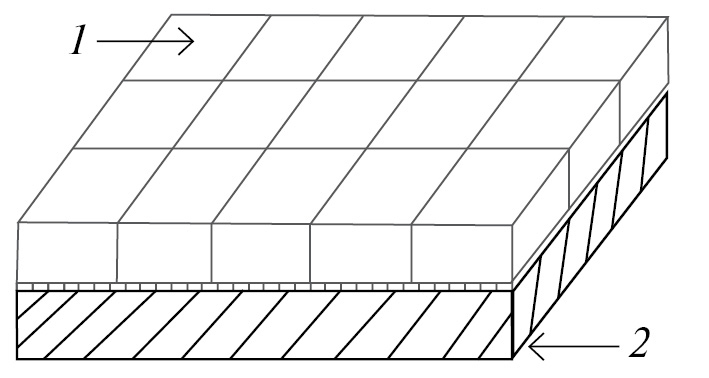 Рис. 1. Двухслойная керамическая защита: 1 – керамические плитки, 2 – подложка.