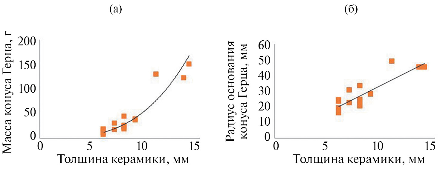 Рис. 4. а – Зависимость массы конуса Герца от толщины керамики; б – зависимость радиуса основания конуса Герца от толщины керамики.