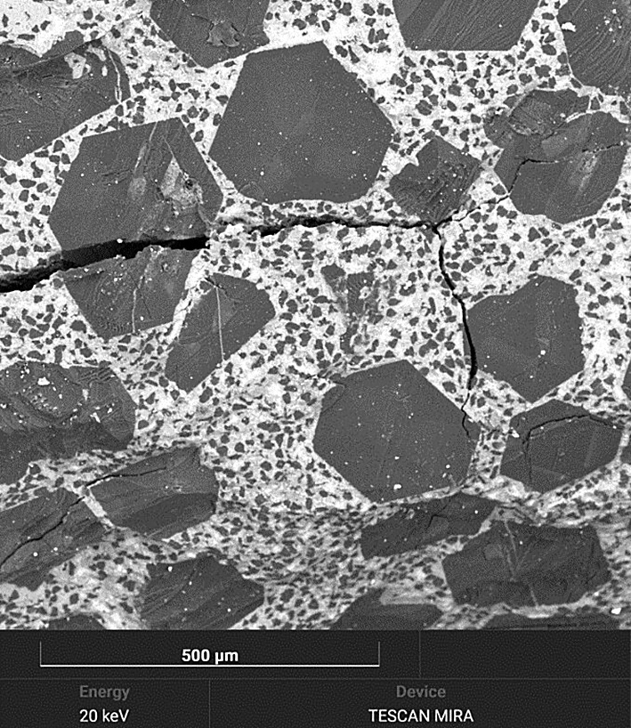 «Идеал» – новый тип реакционно-спеченного композиционного материала, который получен реакционным спеканием путем заполнения пор заготовки из алмазных частиц расплавом жидкого кремния до получения беспористой композитной структуры. Благодаря практически полному отсутствию пор и прочной межфазной связи композит «Идеал» обладает высокими физико-механическими характеристиками [7–9]. В таком материале формируются структуры с геометрией трижды периодических поверхностей минимальной энергии (ТППМЭ). Известно, что формирование ТППМЭ на микро- и макроуровнях позволяет достигать высоких механических свойств [10, 11]. Математические основы формирования регулярных структур с геометрией ТППМЭ описаны С. Хайдом в работе [12].