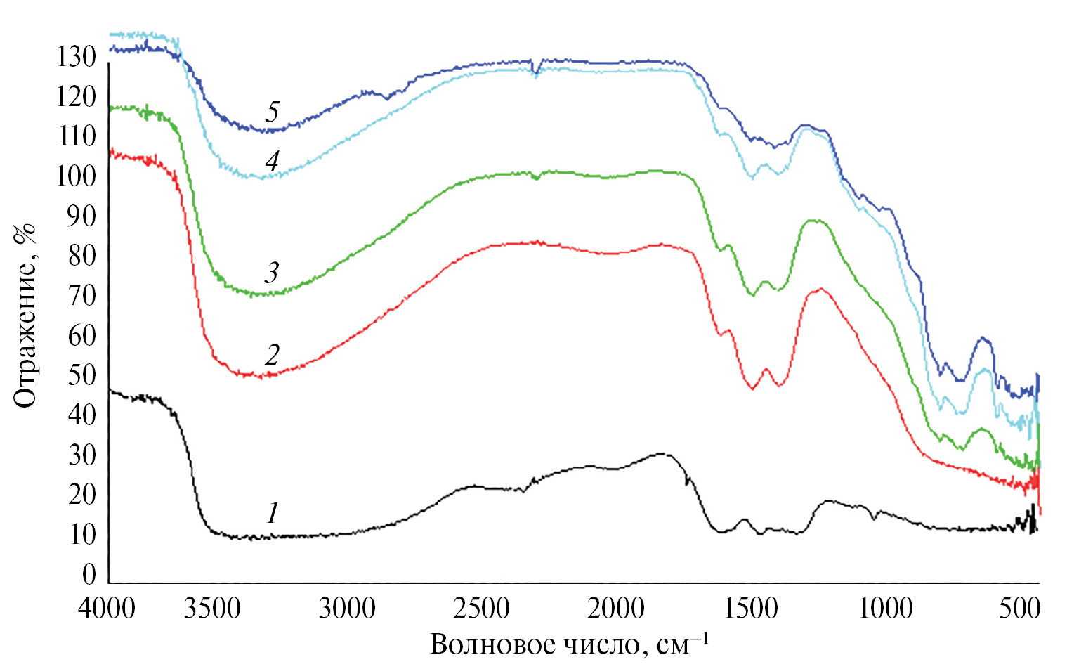 Рис. 4. ИК-спектры порошков Y3Al5O12 : Се, полученных методом горения смеси нитратов в лимонной кислоте и прокаленных при различных температурах, °С: 1 – 700, 2 –900, 3 – 1000, 4 – 1100, 5 – 1200.