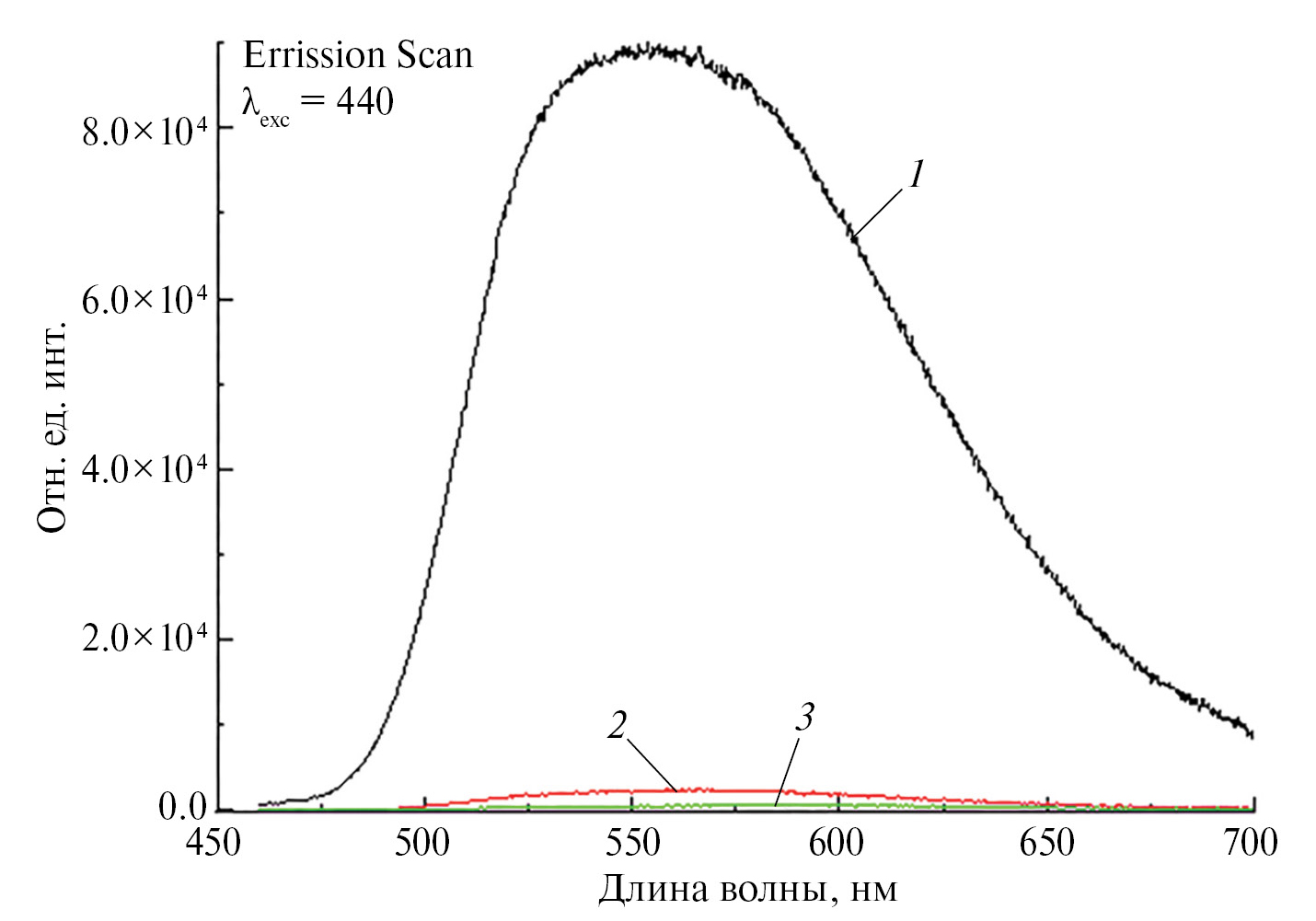 Рис. 8. Спектры люминесценции композита YAG : Ce (λвозб = 440 нм) в зависимости от концентрации частиц в составе легкоплавкого стекла: 1 – 5 мас. %, 2 – 10 мас. %, 3 – 30 мас. %.