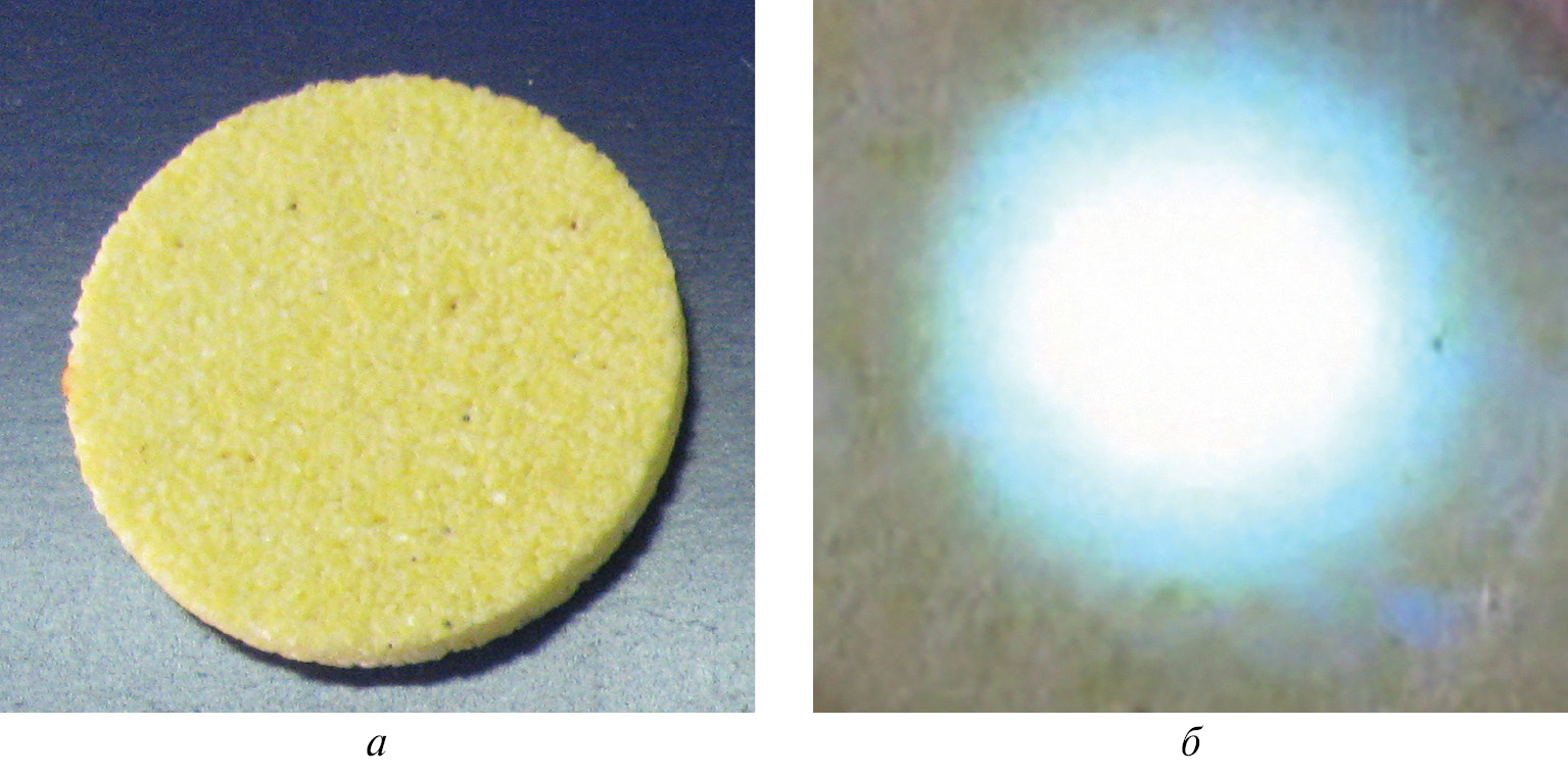 Плотность полученных образцов спеченных композитов составляла от 76.5 до 84.8% от теоретической плотности кварцевого стекла, а пористость достигала около 25%. Таким образом, формируемые композиционные диски представляют собой пористую стеклокристаллическую керамику, в объеме которой распределены частицы люминесцентного порошка в составе легкоплавкого стекла-связки. Внешний вид люминофорных композиционных дисков на основе системы «порошок люминофора – легкоплавкое стекло – кварцевый наполнитель» приведен на рис. 9.