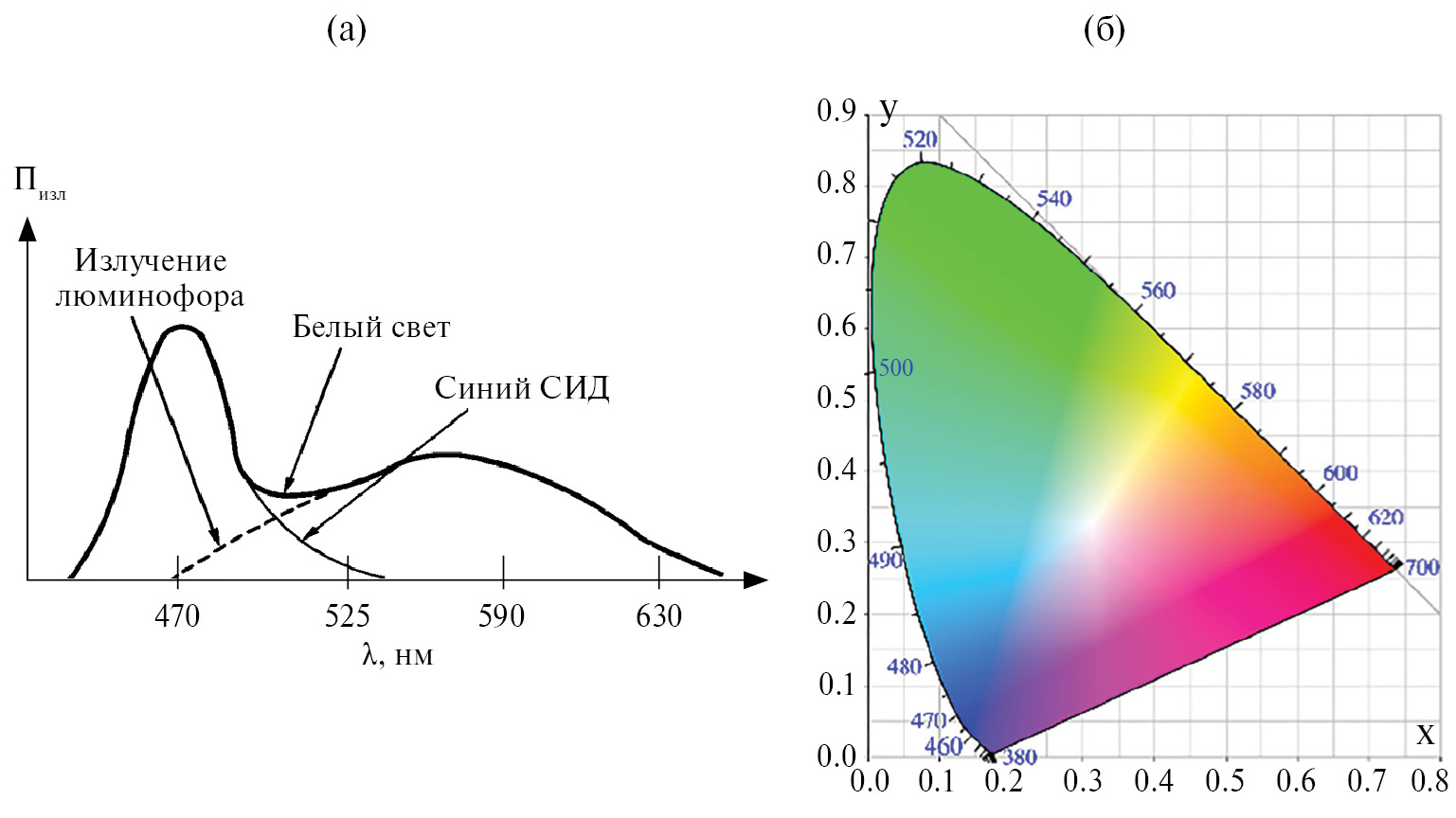 Рис. 10. Суммарный спектр излучения синего светодиода и композиционного светопреобразователя (а) и диаграмма цветности (б).