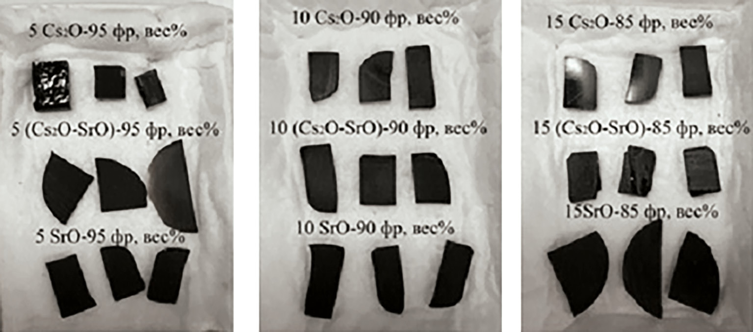 Для составов 7–9 (табл. 1) соотношение оксидов Сs и Sr было определено исходя из их количеств в жидких ВАО.