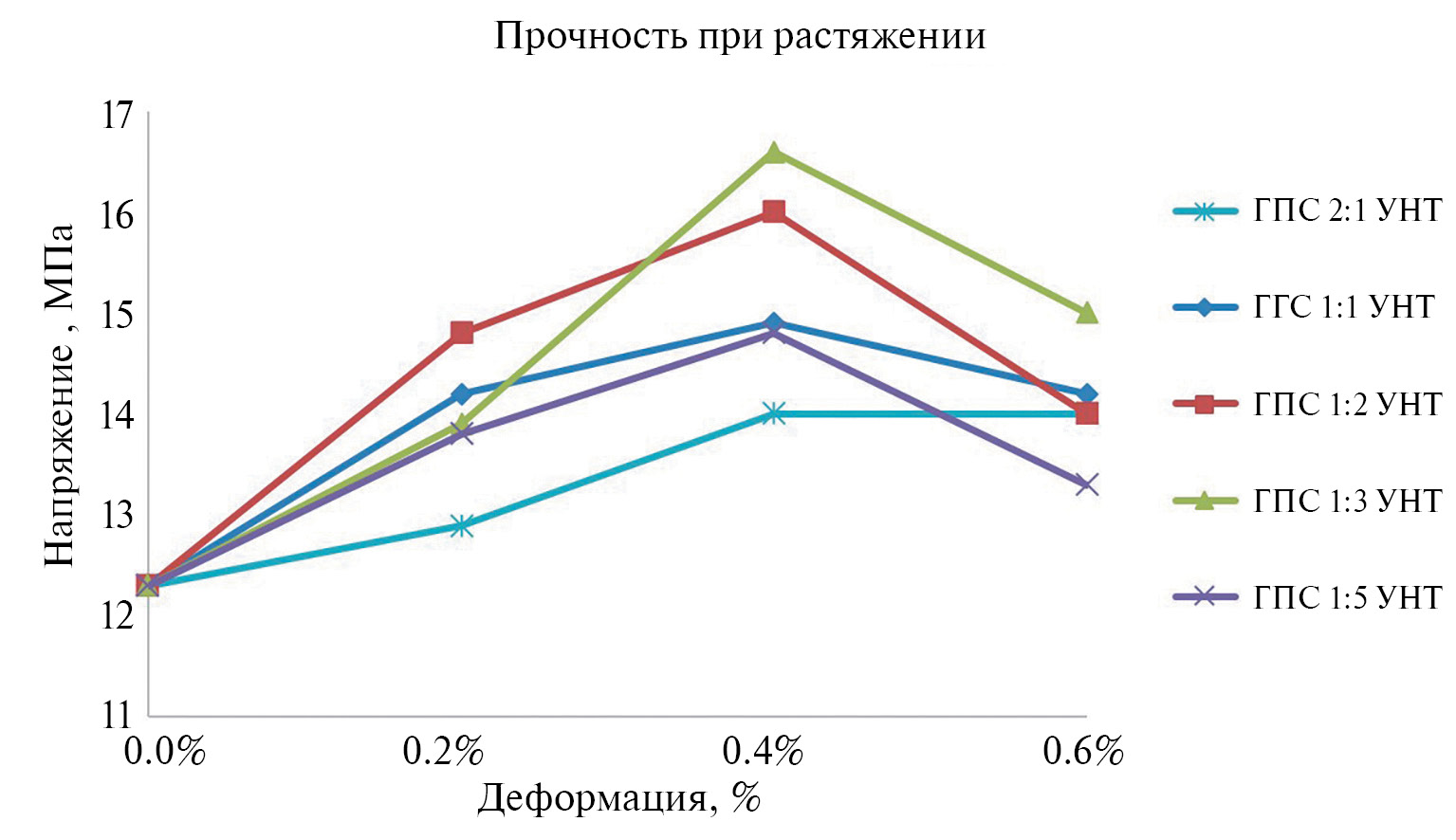 Для каждого соотношения взяты содержания добавок 0.2, 0.4 и 0.6 мас. % исходя из оптимальных концентраций по одиночным наполнителям ГПС и УНТ (рис. 7, 8). Отклонение показателей при параллельных испытаниях составило не более 5%.