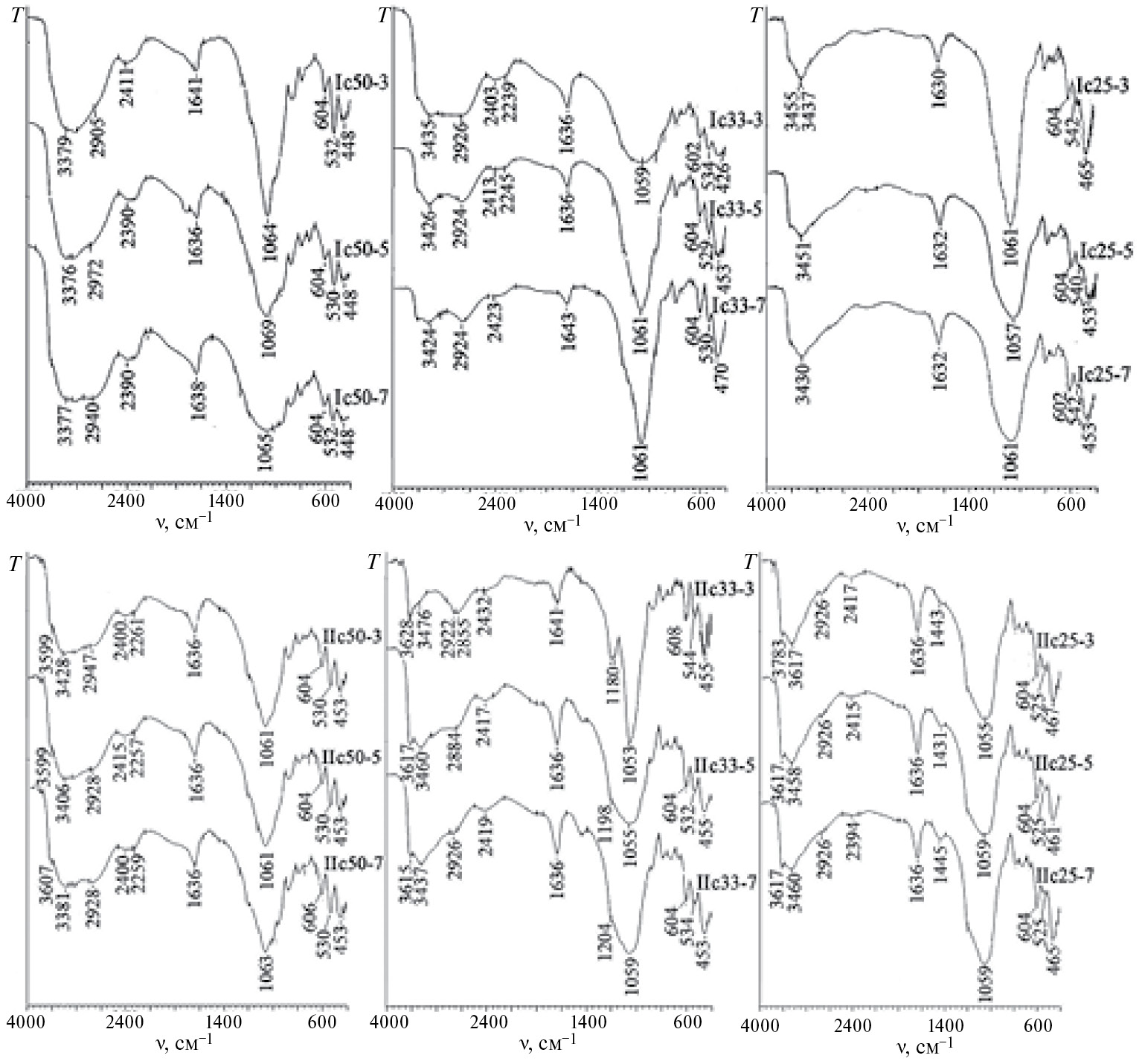 ИК-спектры образцов на основе клиноптилолит-стильбитовой породы (Ic25-3; Ic25-5; Ic25-7), полученных вследствие механохимической активации смеси с содержанием 25 мас. % тригидрата гидрофосфата калия, имеют вид спектра «цеолитной матрицы», без полос поглощения в области от 2800 до 1700 см–1 (рис. 3), принадлежащих валентным и обертонам деформационных колебаний ОН-групп кислой соли. В области валентных колебаний ОН-групп молекул воды (3500–3400 см–1) регистрируются полосы поглощения со смещающимися при увеличении дозы механической энергии максимумами. Количество полос поглощения в указанной области повышается до двух или трех для образцов с соотношением клиноптилолит-стильбитовая порода : соль равным 2 : 1 (Ic33-3; Ic33-5; Ic33-7), что свидетельствует о наличии нескольких гидратных форм с различной энергией. В ИК-спектрах образцов с эквимассовым соотношением клиноптилолит-стильбитовой матрицы и модификатора (Ic50-3; Ic50-5; Ic50-7) регистрируются широкие полосы поглощения с тремя максимумами, положения которых чувствительны ко времени механического ударно-сдвигового воздействия. Полоса поглощения деформационных колебаний молекул воды при 1630– 1641 см–1 также незначительно смещается при увеличении содержания соли, дозы подведенной энергии. Выявлено смещения на инфракрасных спектрах полос поглощения валентных колебаний ОН-групп цеолита (3600–3700 см–1) и валентных колебаний групп Р=О при водородных связях (1200 см–1).