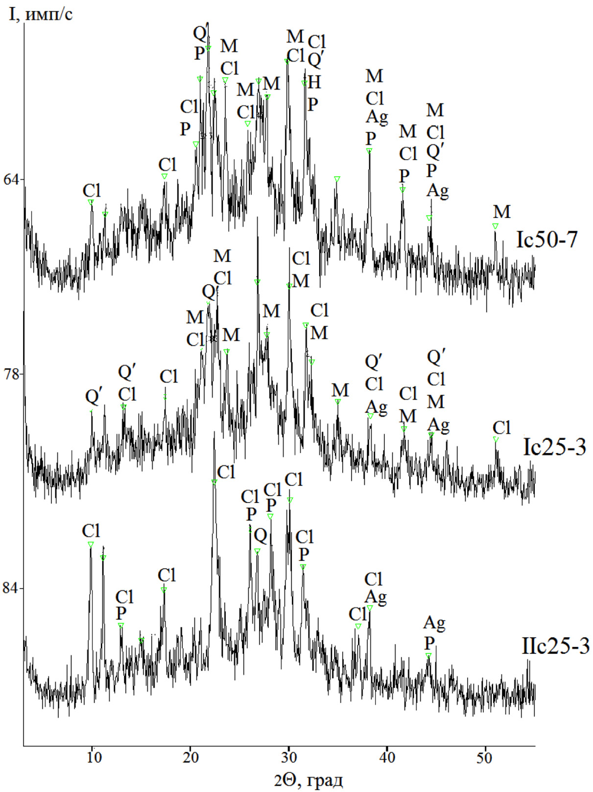 Рис. 8. Рентгеновские дифрактограммы образцов после вжигания серебряной пасты и измерения электропроводности при нагревании до 600 °С: I, II – клиноптилолит-стильбитовая и клиноптилолитовая породы соответственно; с – гидрофосфат калия тригидрат; 25, 50 – содержание соли, мас. %; 3, 7 – время механоактивации, мин; Ag – серебро; Cl – клиноптилолит; Н – галит; М – ортоклаз; Р – гидрофосфат калия; Q – кварц; Q´ – кристобалит.